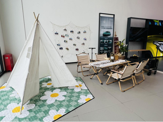 不仅是展示车型,在瑞马众力上汽大众4S店内,入口及参观区都布置着户外露营必备的帐篷、桌椅、零食及装饰气球、灯带,一股浓浓的露营休闲风迎面而来。面对近一两年流行的户外露营,出行汽车必定对车内空间、动力要求比较高。曾宽说,店内展示的途昂车型,能够提供3种动力、支持8种驾驶模式切换,可以满足不同路面的使用情况。特别是途昂第二排、第三排可以放倒平直,买一个气垫床,在外面露营就不用去住帐篷了。