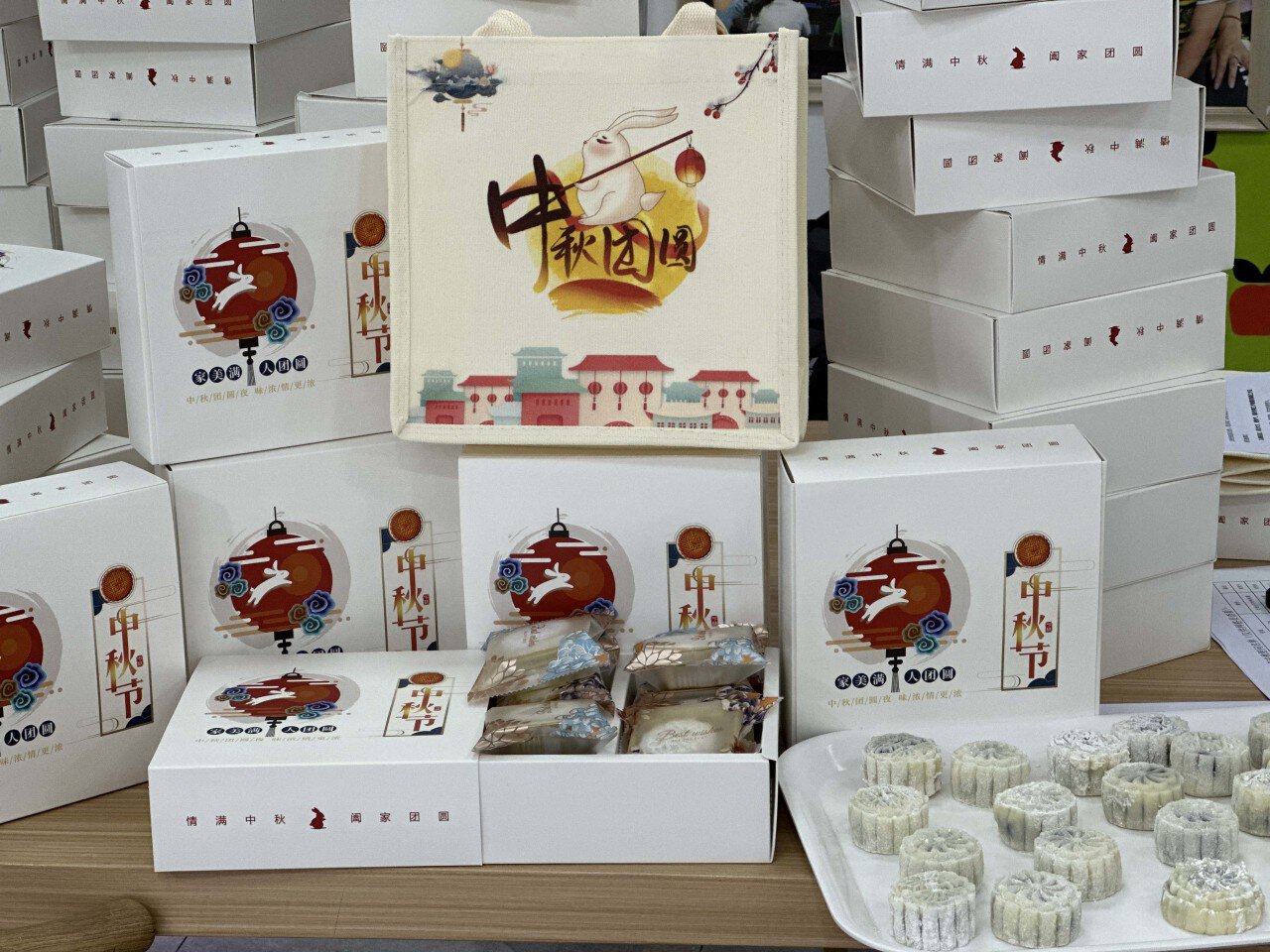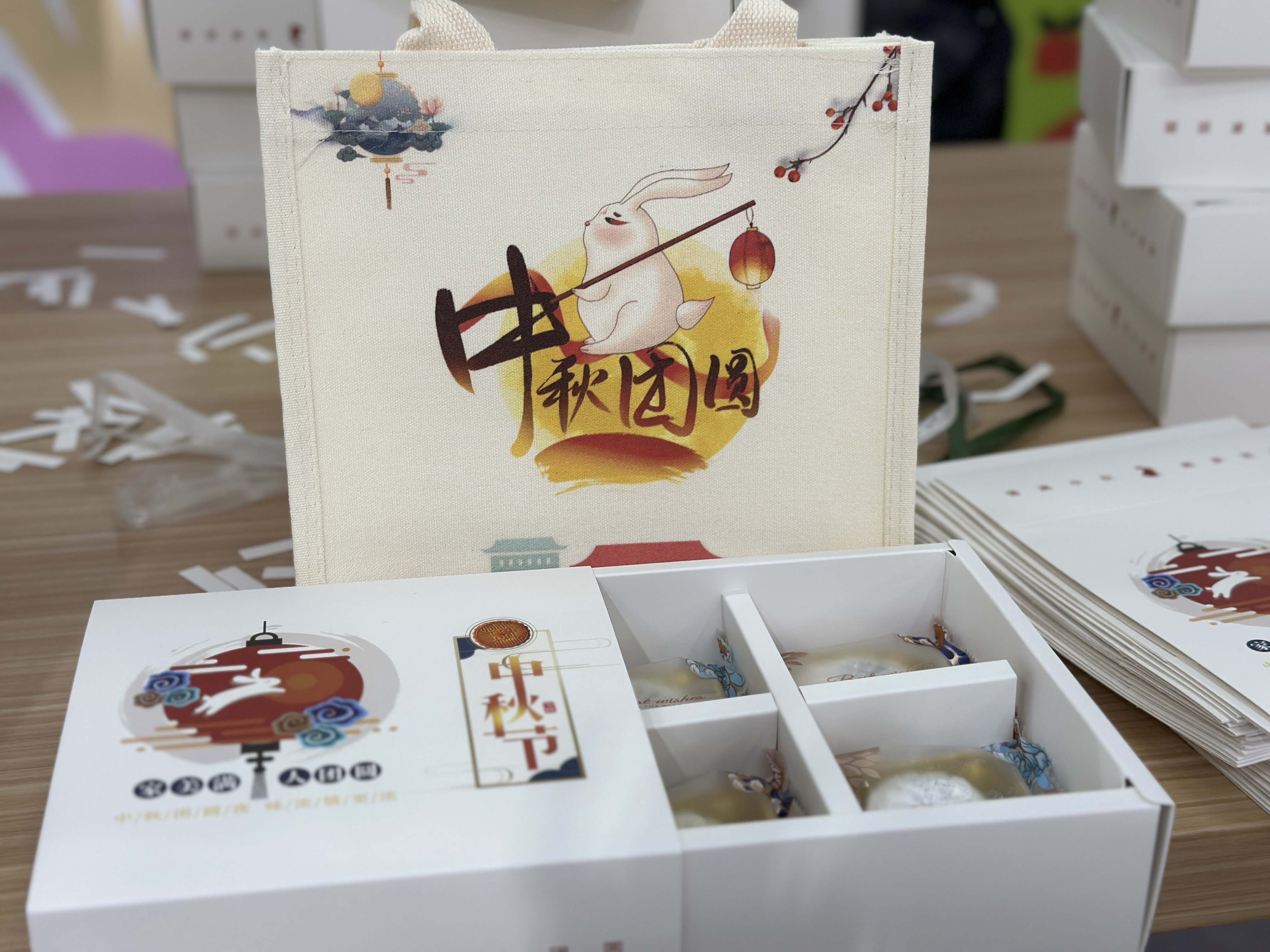 月饼制作好以后,大家又小心翼翼地用小包装盒将其一个个装好,再放入“中秋团圆”的礼品盒中,一盒盒带着手工与关爱温度的月饼就制作完成了。
