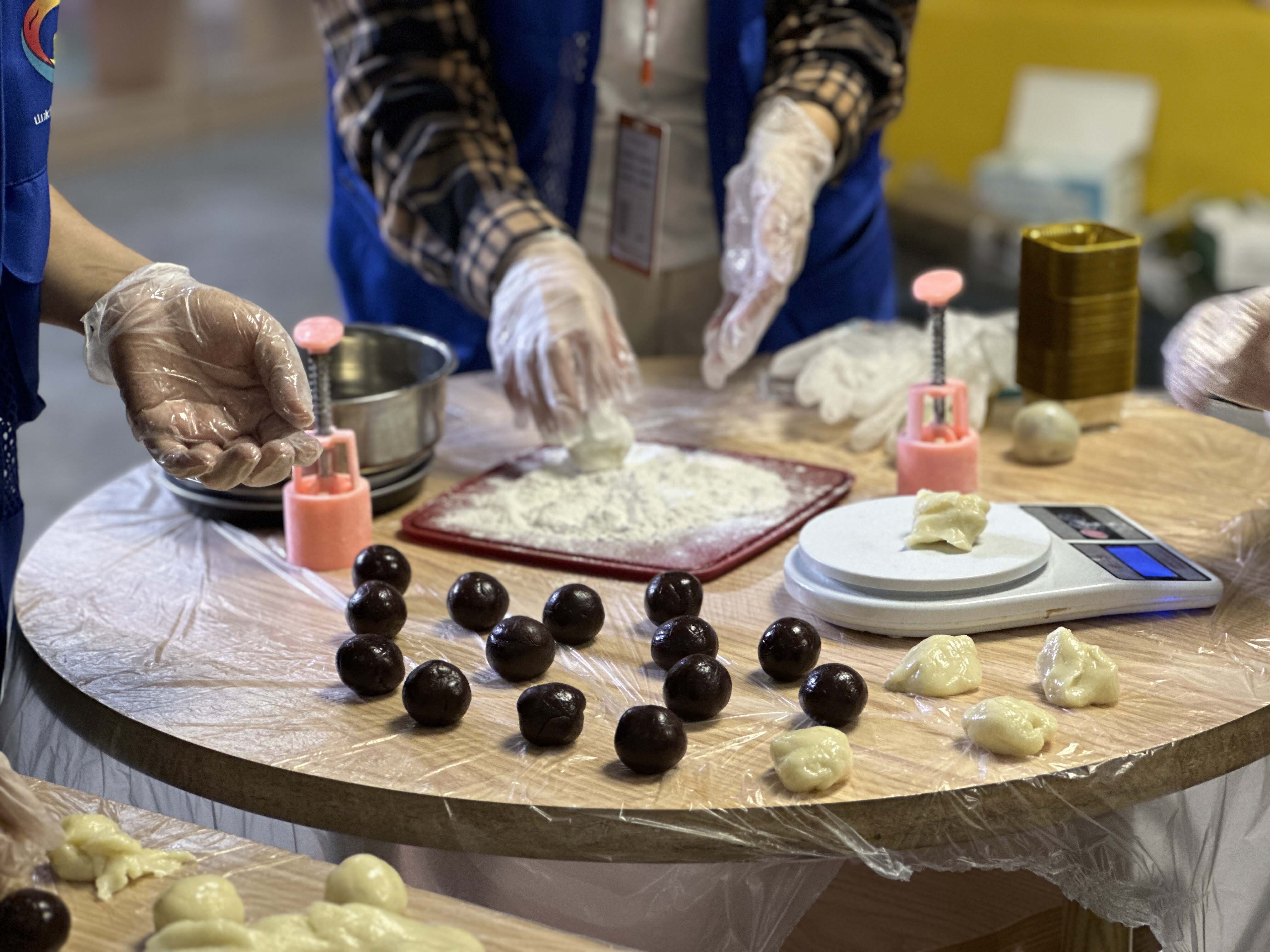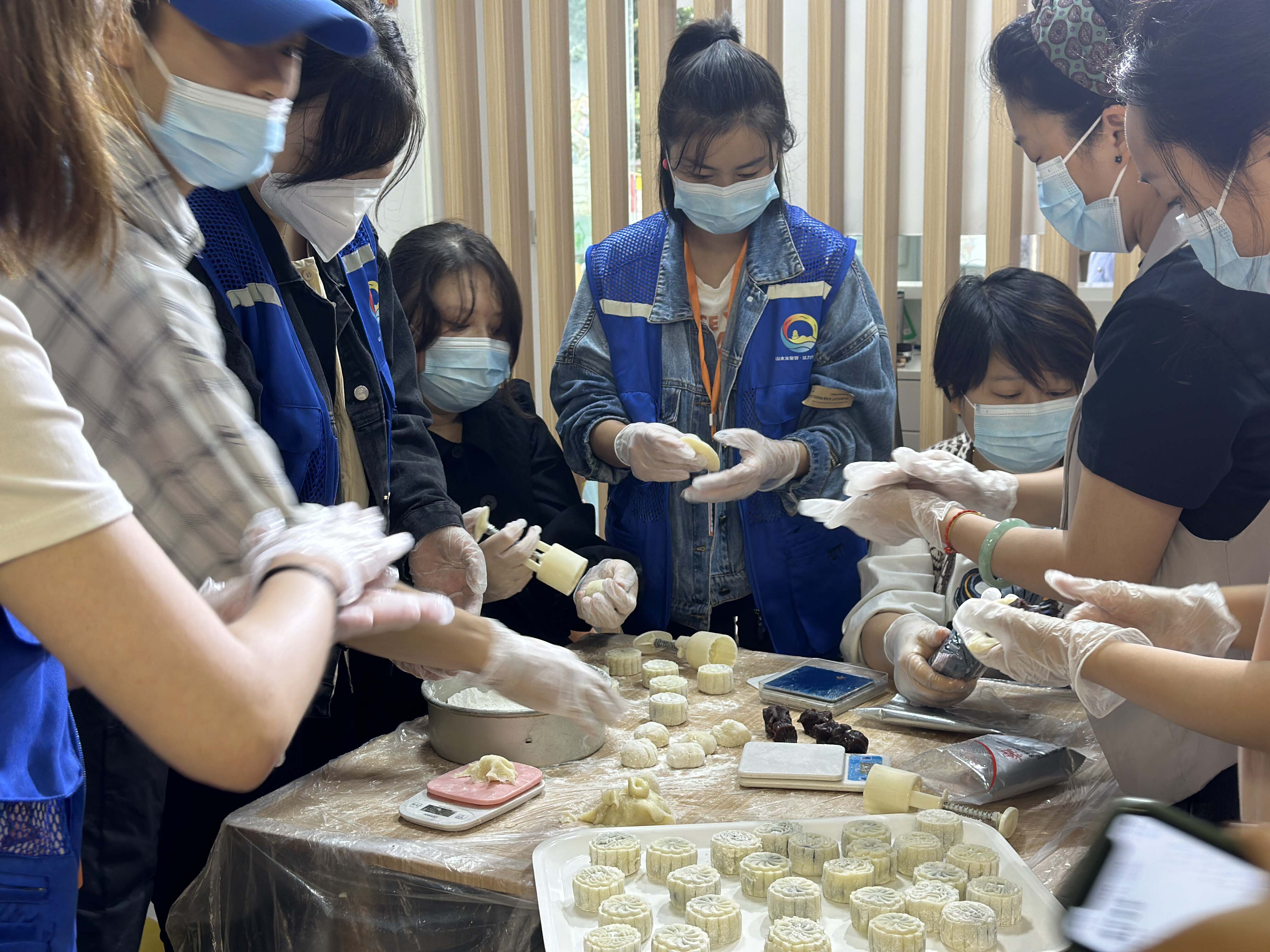 “将面团分成大小均等的剂子,最好用秤称一下确保大小一致,压扁后放入馅料,小心包紧不要露馅,最后放入模具压实……”活动现场,有西点制作经验的网格员向大家详细讲解了制作手工冰皮月饼的步骤和技巧。掌握了相关要领后,大家有的分剂子、有的包馅、有的压模子,分工明确、配合默契,一个个好看又好吃的小月饼便呈现了出来。