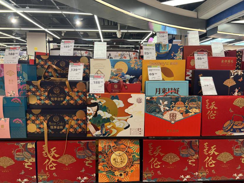 9月26日,记者在永辉超市万达广场店发现,大红灯笼和五星红旗将超市装扮一新。百余盒月饼占据了超市的“C位”,优越的地理位置和精致的礼盒包装吸引了不少消费者驻足。这些月饼礼盒最低价格为69元,最高不超过500元。记者看到,今年月饼的口味除了五仁、云腿、莲蓉、豆沙等常规味道以外,超市还准备了不少时下年轻人喜欢的流心蛋黄月饼、芋泥奶酪月饼、川味火锅月饼、黑松露月饼、新派低糖月饼等,让人眼前一亮。
