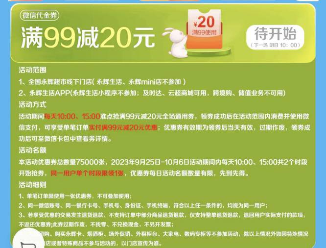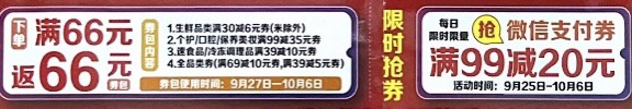 打开线上永辉生活超市,除了免费领取的“50元新人礼包”外,还有“满66元返66元卷包”、“90元减20元优惠券”和5-7.9折等促销优惠。