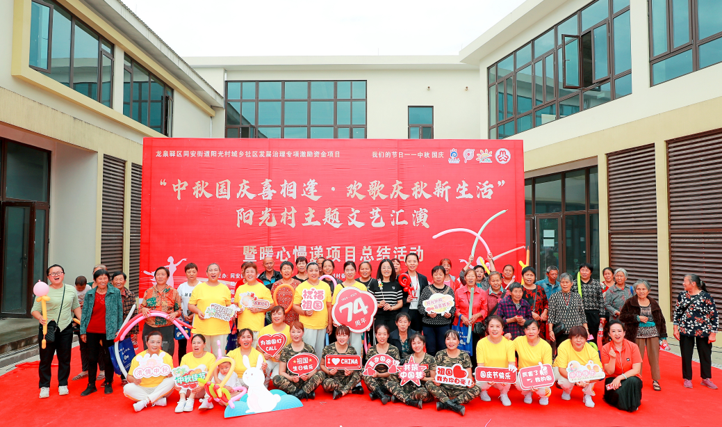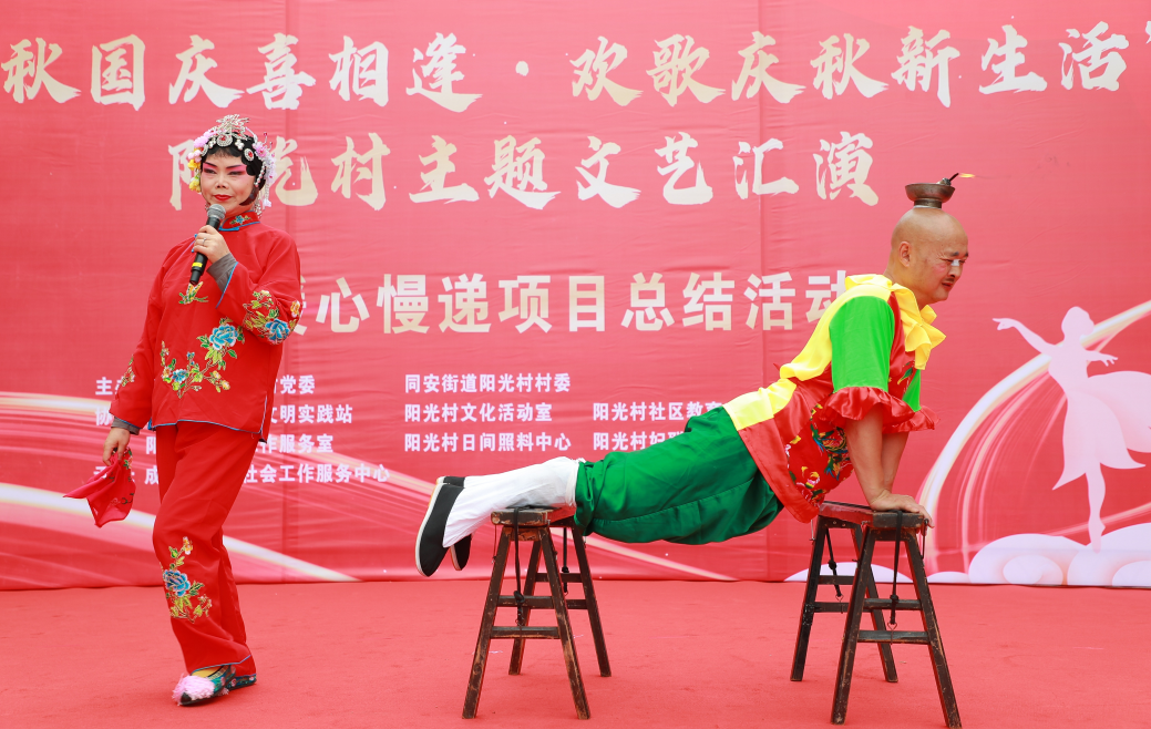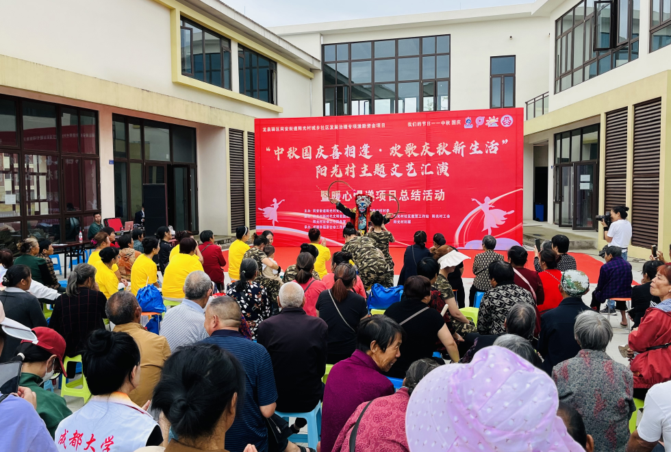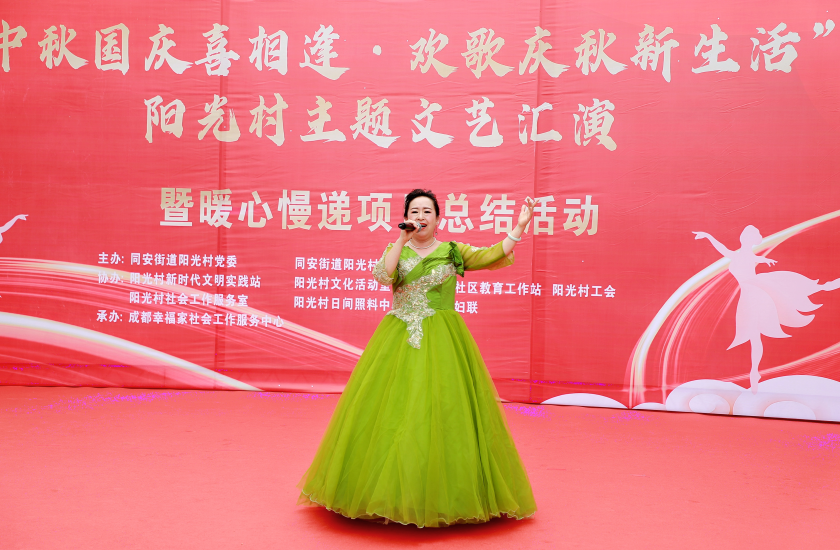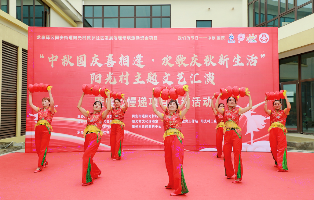 金秋九月,丹桂飘香,国庆中秋双节来临之际,为进一步弘扬中华民族传统文化,增强社区的凝聚力和归属感,庆祝阳光村村民搬入新居。9月25日下午,阳光村携手幸福家社工在阳光新居广场开展“中秋国庆喜相逢·欢歌庆秋新生活”主题文艺汇演活动,展现欢乐祥和、幸福、有爱的社区文化,营造浓郁的节日氛围,让辖区群众过个文明、祥和、欢乐的节日。