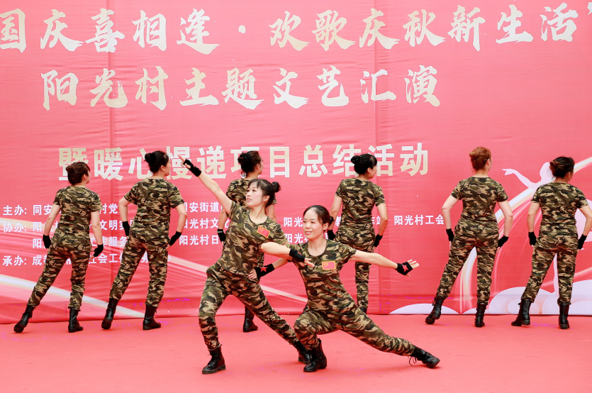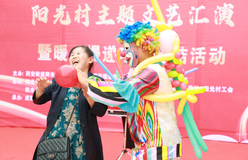 舞台上,由自组织文艺队自编自导带来的表演灯笼舞《祖国你好》《军旅青春》腰鼓《舞动中国》等,吸引了一大群居民朋友驻足观看,展现了阳光村村民激情风采,彰显了村民在党的领导下,美好幸福生活场景。歌曲《祝福祖国》、杂技《冰上芭蕾》、滚灯和小丑表演等数节目精彩上演,给活动增色不少。