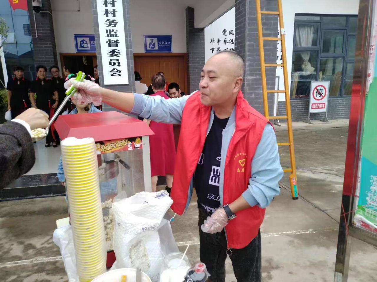 舞台表演结束后志愿者们在非遗师傅的指导下拿着机器、玉米粒、白糖、黄油、冰皮粉等食材,在现场制作爆米花、月饼等食物,玉米、酥油、糖一起放进爆米花机,不一会儿,香味扑鼻的爆米花便出锅了,飘散的香味吸引了不少的村民。随着社工老师戴好一次性手套拿起冰皮,仔细揉圆再压扁,加上馅,最后用模具压平,一个个香甜可口的冰皮饼也完成了。
