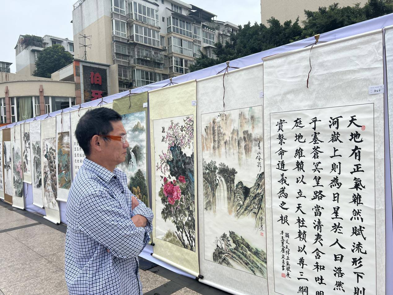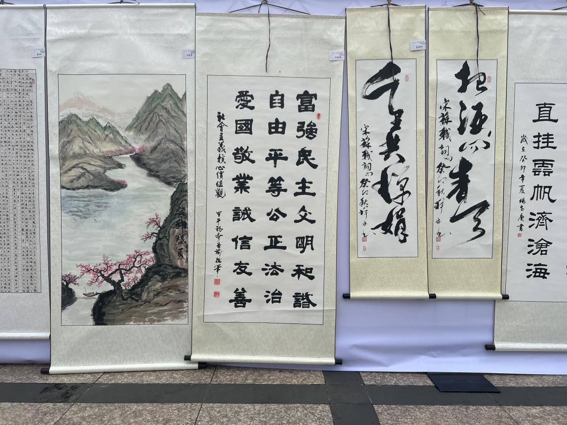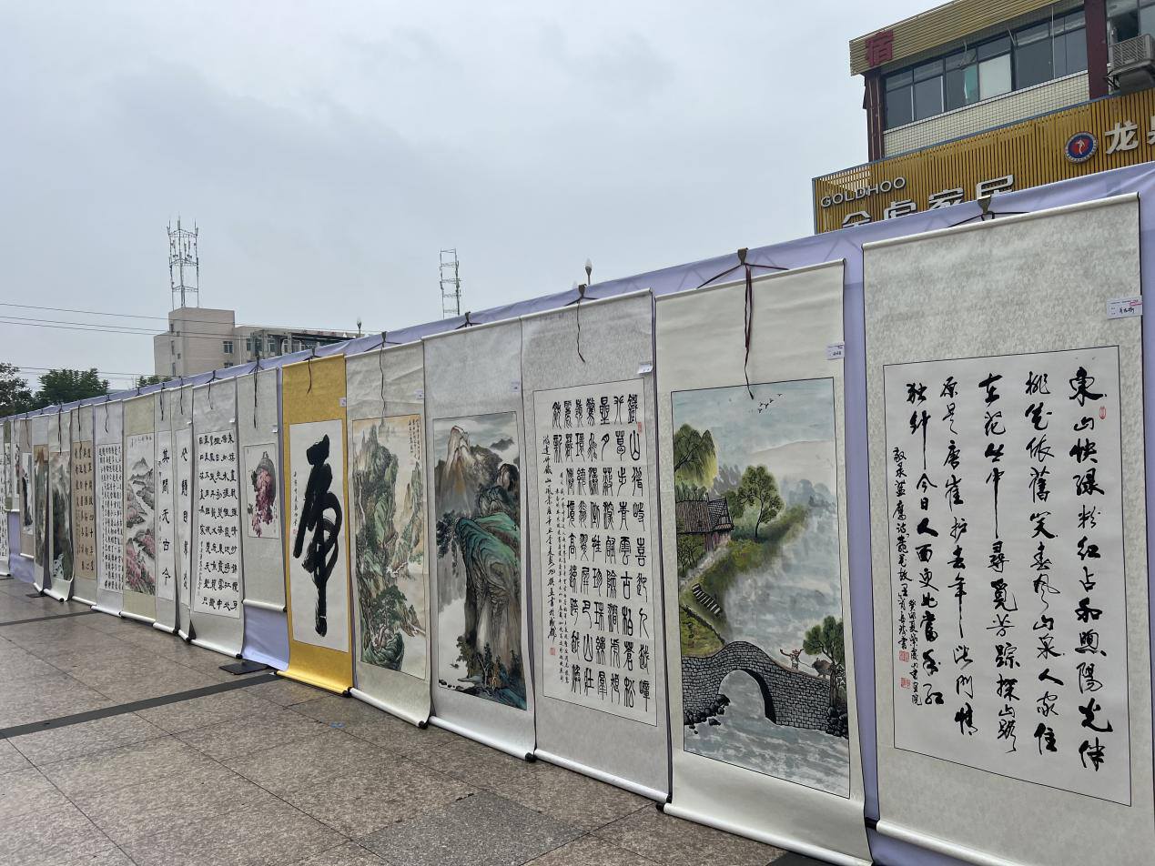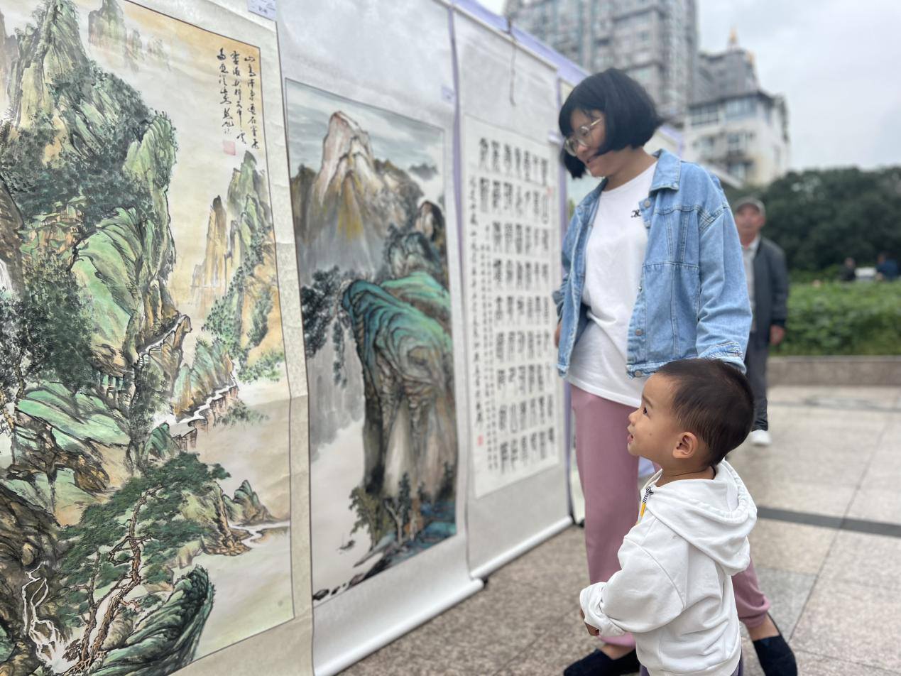 “祖国万岁”“梦里桃香”等100余幅优秀书法、绘画作品悬挂在同安街道金山广场。一幅幅主题鲜明、风格多样的书画作品吸引来了不少观众,他们或驻足欣赏,或交流心得,置身书画的长廊中,近距离领略书画艺术魅力。
