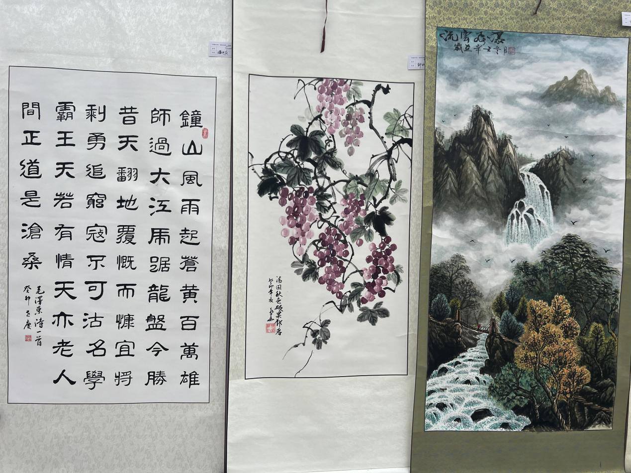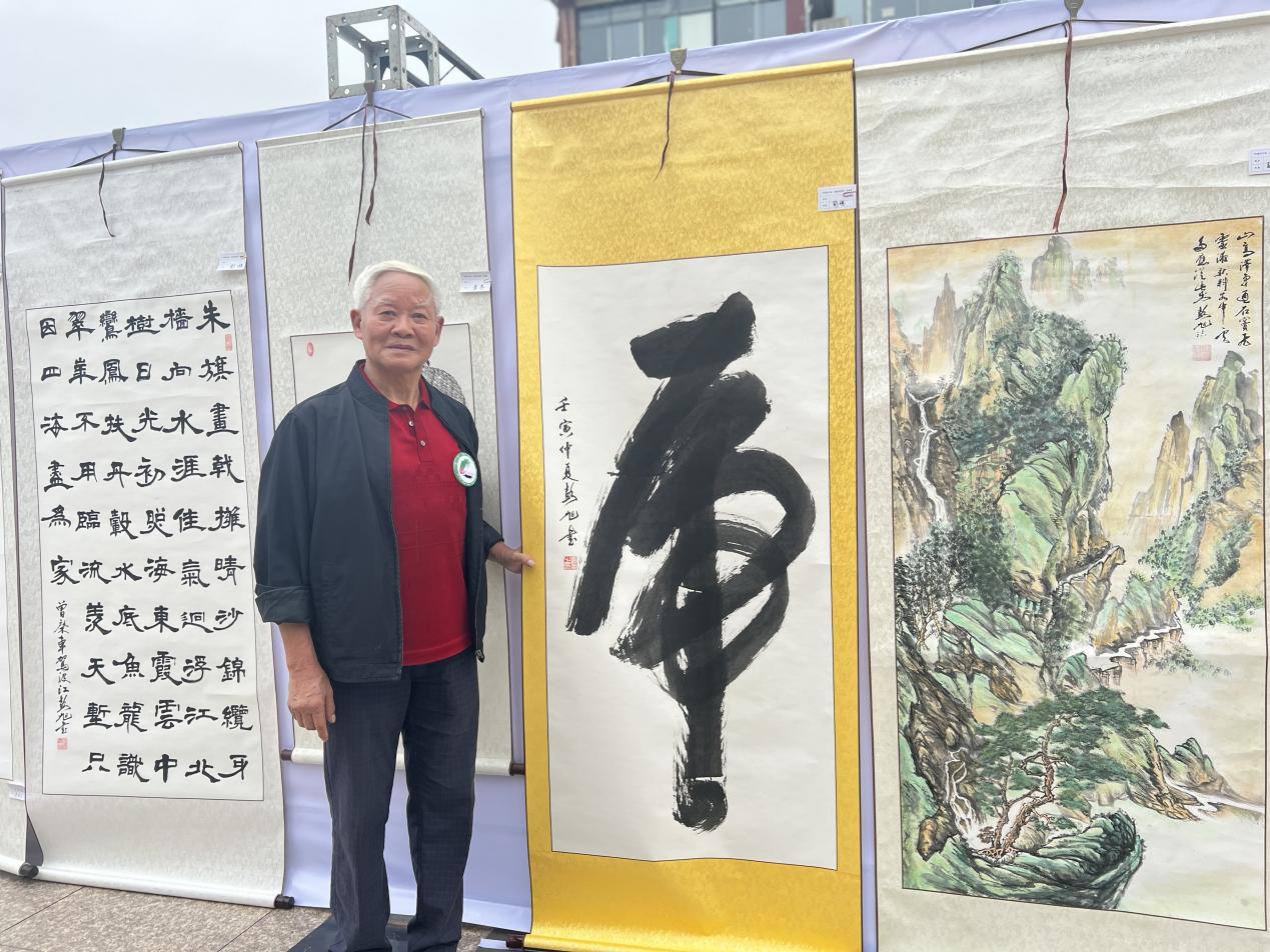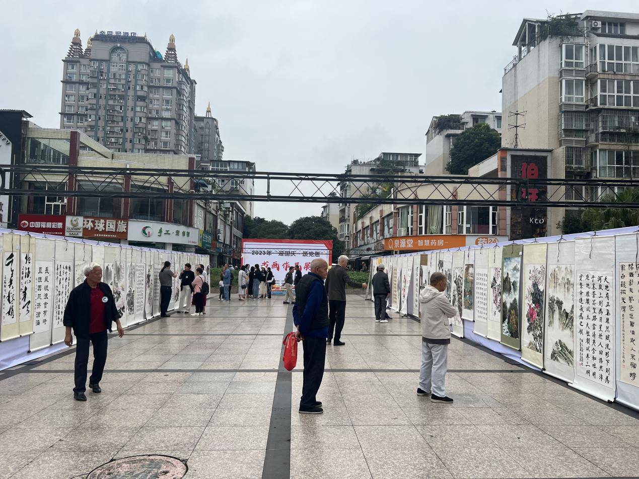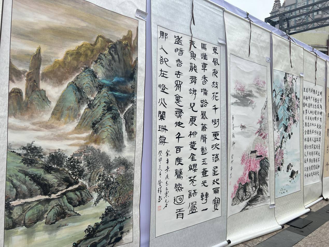 “祖国万岁”“梦里桃香”等100余幅优秀书法、绘画作品悬挂在同安街道金山广场。一幅幅主题鲜明、风格多样的书画作品吸引来了不少观众,他们或驻足欣赏,或交流心得,置身书画的长廊中,近距离领略书画艺术魅力。
