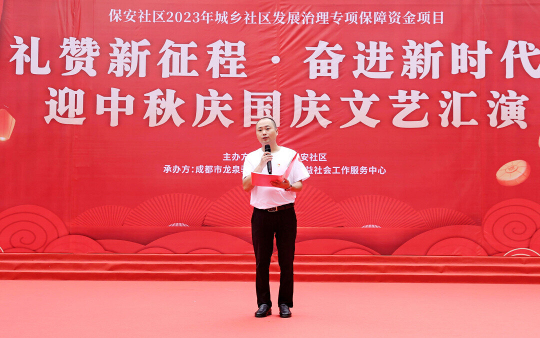 保安社区党支部书记张军进行活动致辞,鼓励每一位居民,怀家国之心,担时代重责,用踏实行动让人生价值绽放于家国梦想之中。对辖区共建单位、社区自组织、志愿者及辖区居民等表达感谢,并送上节日问候与美好祝福。
