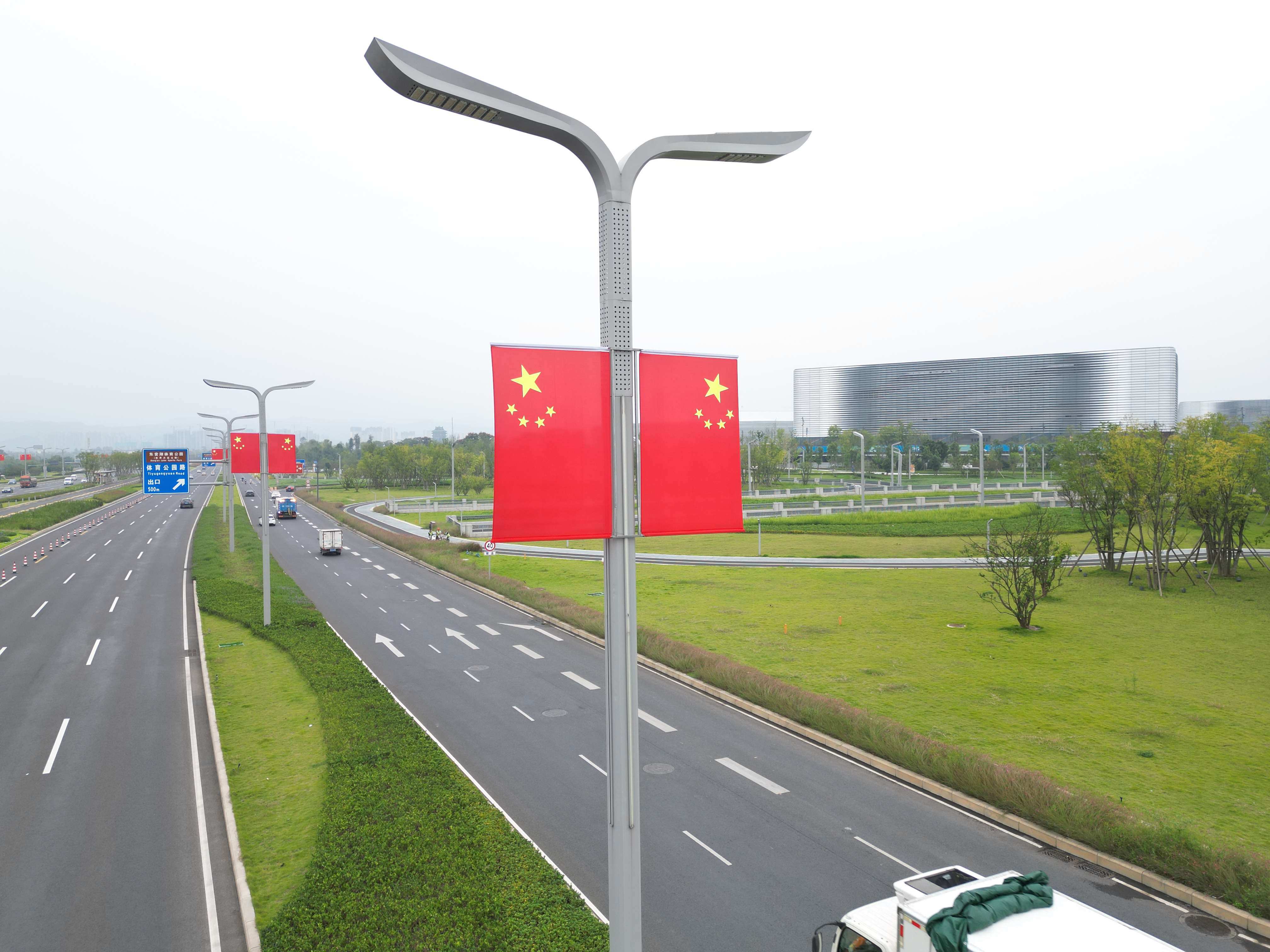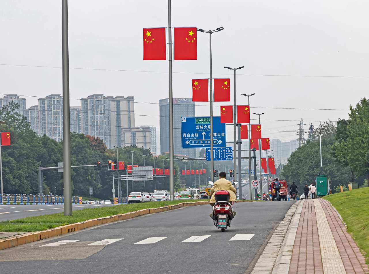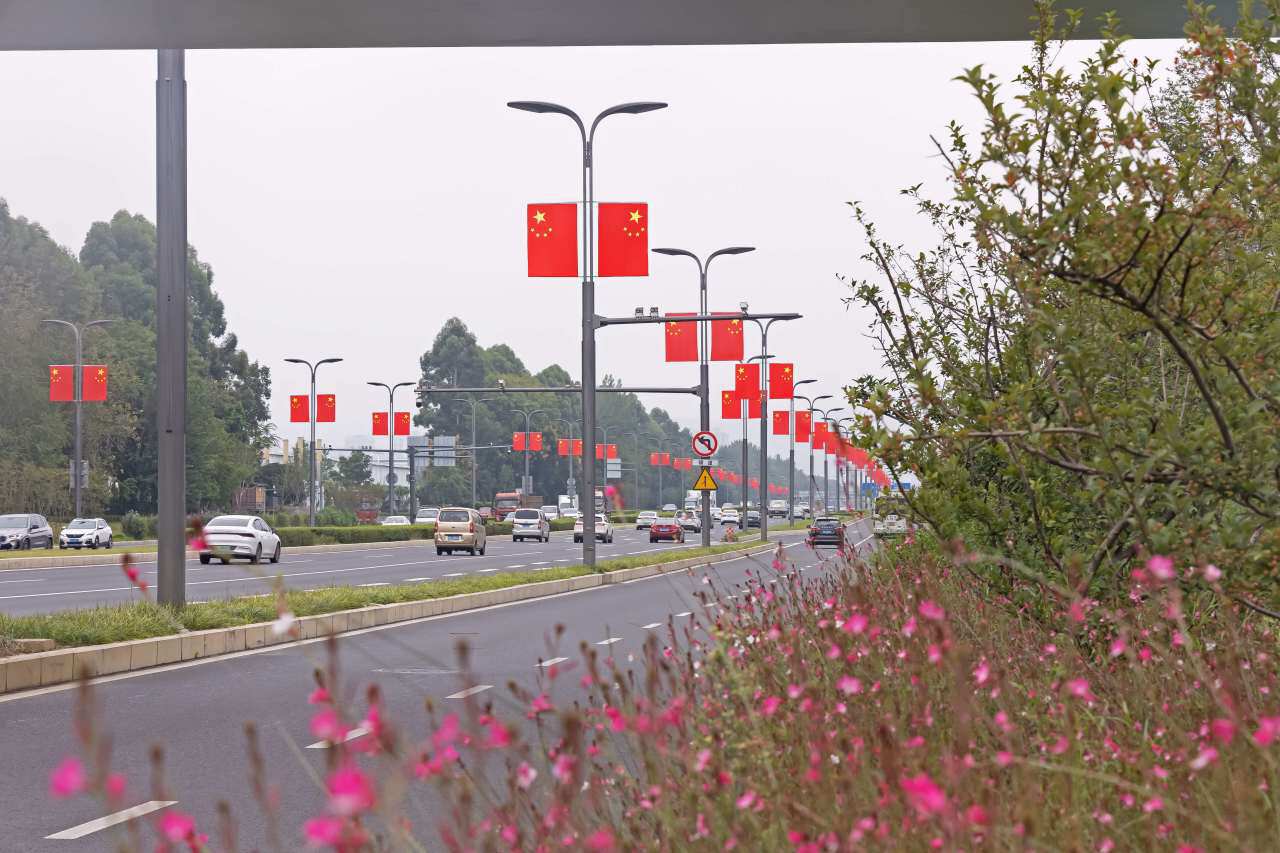 据了解,龙泉驿区在城区各主要交通干道悬挂国旗共2560面,包括东安大道、驿都大道、蜀都大道、龙都南路、航天南路、成龙大道、桃都大道等。一股喜庆的红色浪潮让人倍感振奋,更引得过往市民纷纷拍照留念。
