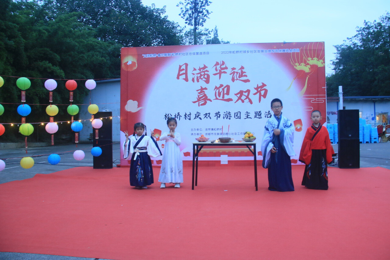 秋意渐浓,丹桂飘香。在中秋国庆来临之际,为促进居民互动交流,营造喜庆祥和的节日氛围,弘扬传承优秀的传统文化习俗。2023年9月27日晚,由松桥村举办的“月满华诞•喜迎双节”庆双节游园活动在龙泉驿怡新广场开展。