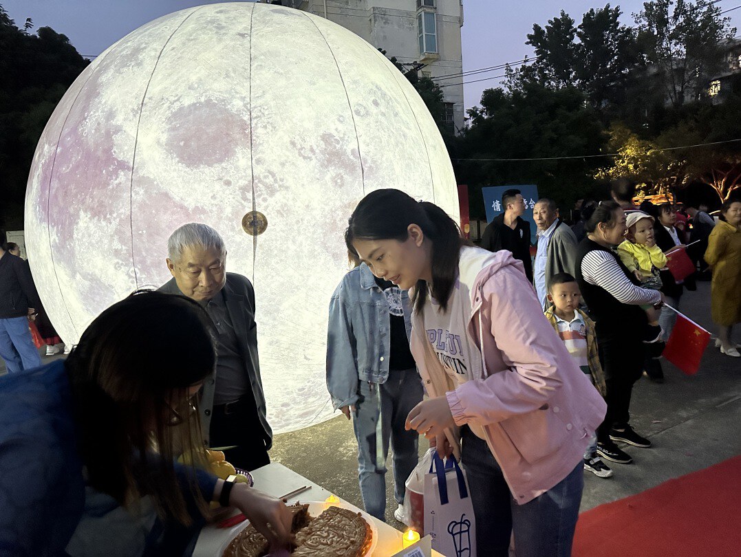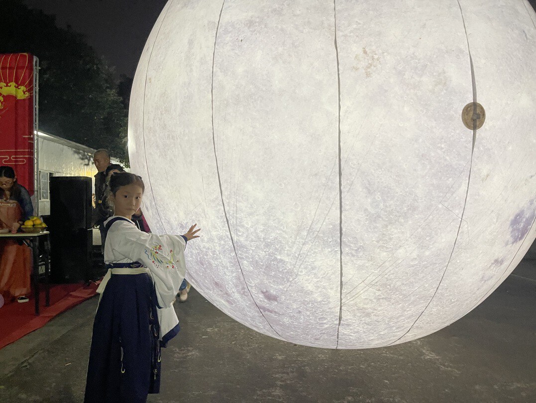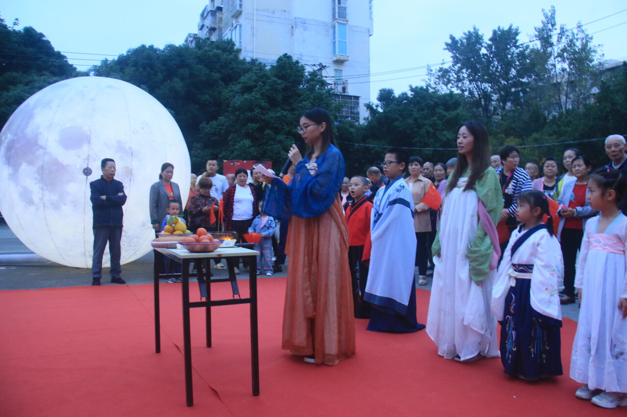 活动开始前,志愿者们精心布置了活动场地,彩色的灯谜灯笼、红旗飘带、3M直径的月亮造型灯,营造了浓厚的中秋节和国庆节氛围。在悠扬的古筝音乐声中,活动拉开了序幕。活动的第一个环节是让大家了解传统文化民俗中的拜月仪式,主祭摆好了香案祭桌,包括香烛、月饼、新鲜水果等。