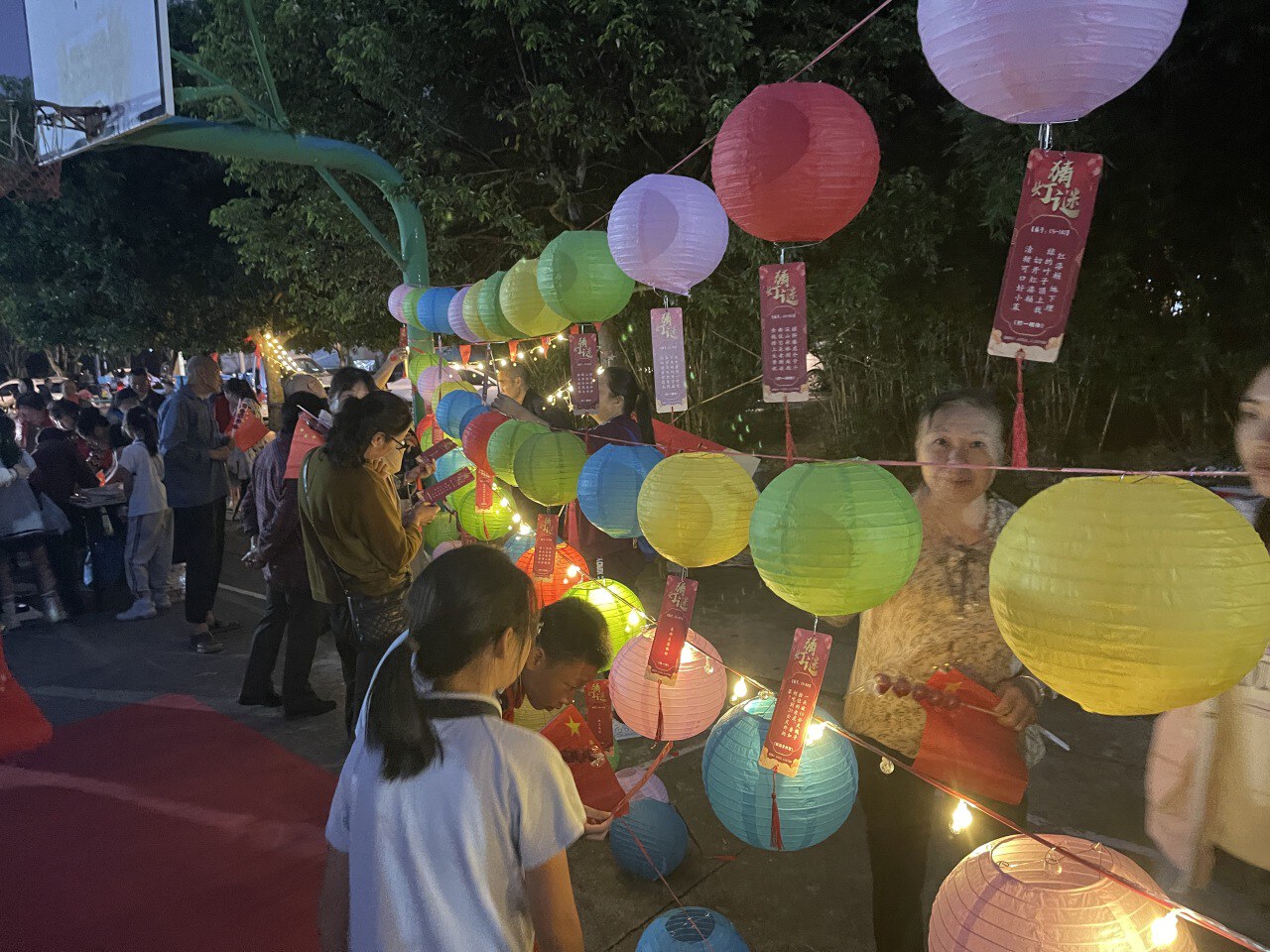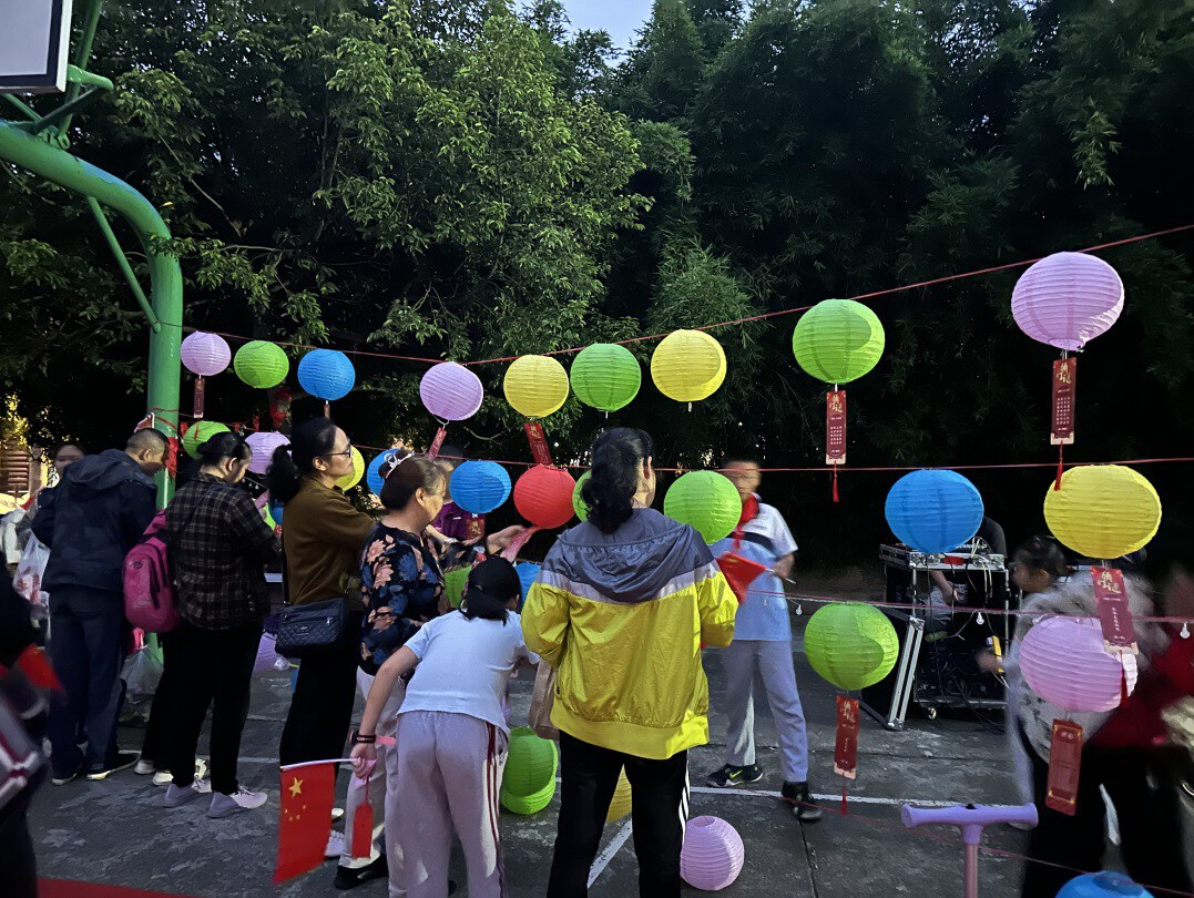 接着主祭带领身着汉服的居民和青少年带领大家一起朝月神拜月,祈求福佑。拜月仪式结束后,大家开始正式游园,大家有序领取游园券和手持小红旗后,依次在灯谜区、游戏区打卡,“我猜对了我猜对了”,现场欢呼声此起彼伏,猜对灯谜的居民们激动的跑向谜底兑奖处领取了月饼一份。另外,活动现场提供了汉服体验服务,对汉服感兴趣的居民登记信息后,身着汉服在月亮灯前打卡拍照。愉快的时光总是短暂的,游园活动进行到尾声,居民们凭游园券在民俗小吃体验区领取了冰糖葫芦,随着冰糖葫芦的分发完毕,此次双节游园主题活动落下了帷幕。