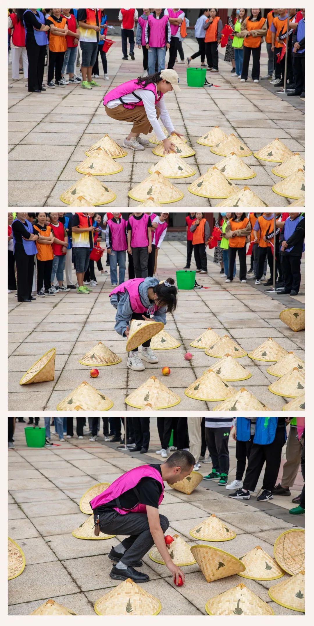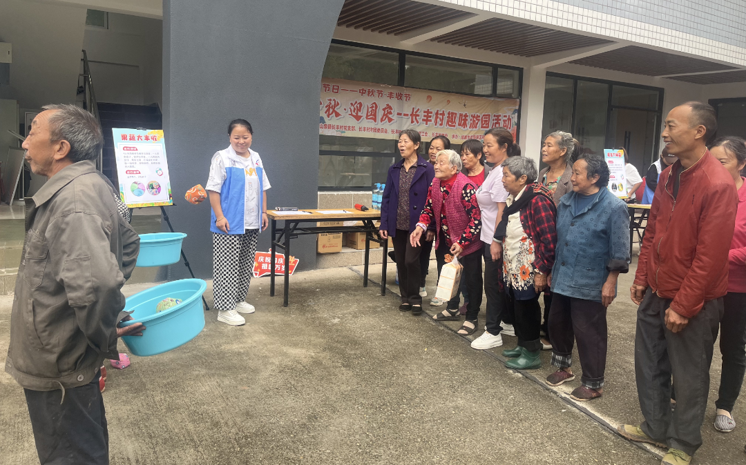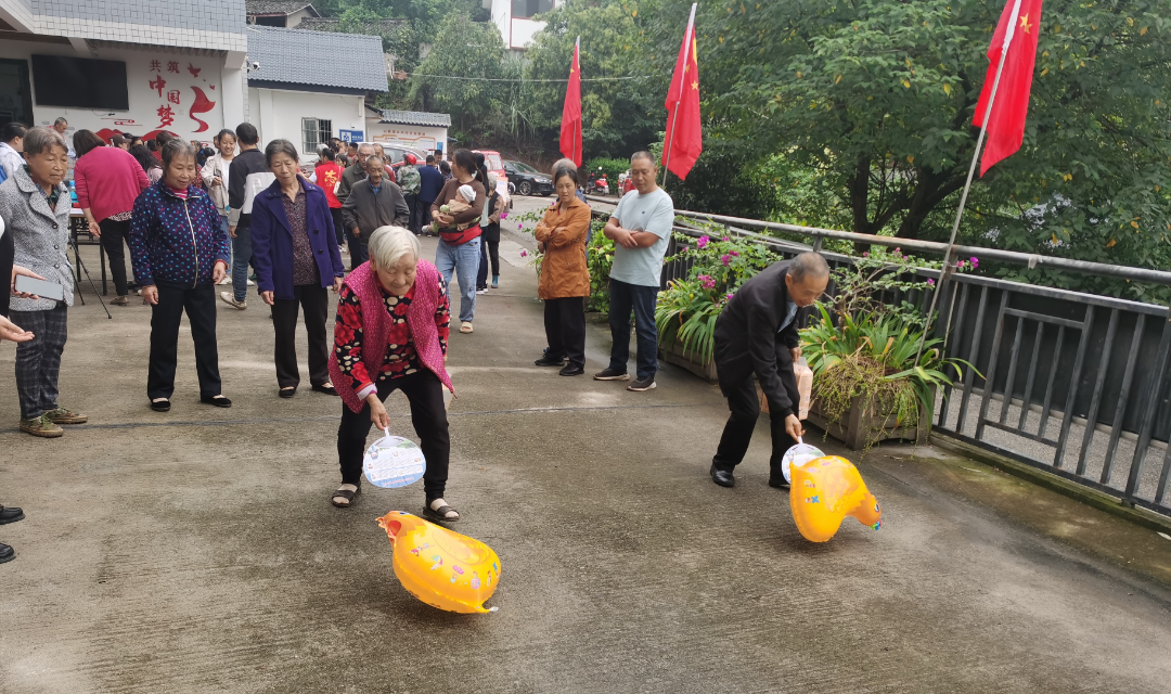 9月26日,长丰村开展“庆中秋·迎国庆”——游园活动,本次活动共设置了四个游戏项目,在巧走农田耕(趣味迷宫)这边,村民们捞起一颗乒乓球,在迷宫农田中“插秧”,体现了农民劳动的辛苦和收获的喜悦。在果蔬大丰收(背篓接绣球)这边,一位村民手持小沙包,一位村民背着小背篓,开始了他们的“采瓜果”之旅。在精准下秧苗(投壶)这边,村民争相登场一试身手,一支支箭飞向前方的壶,紧张刺激又充满乐趣。在“赶鸡入笼”这边,村民们将公鸡造型的气球用蒲扇赶进桶里,上演村民与“鸡”的你追我赶。现场掌声此起彼伏,村民们脸上洋溢着幸福的笑容。