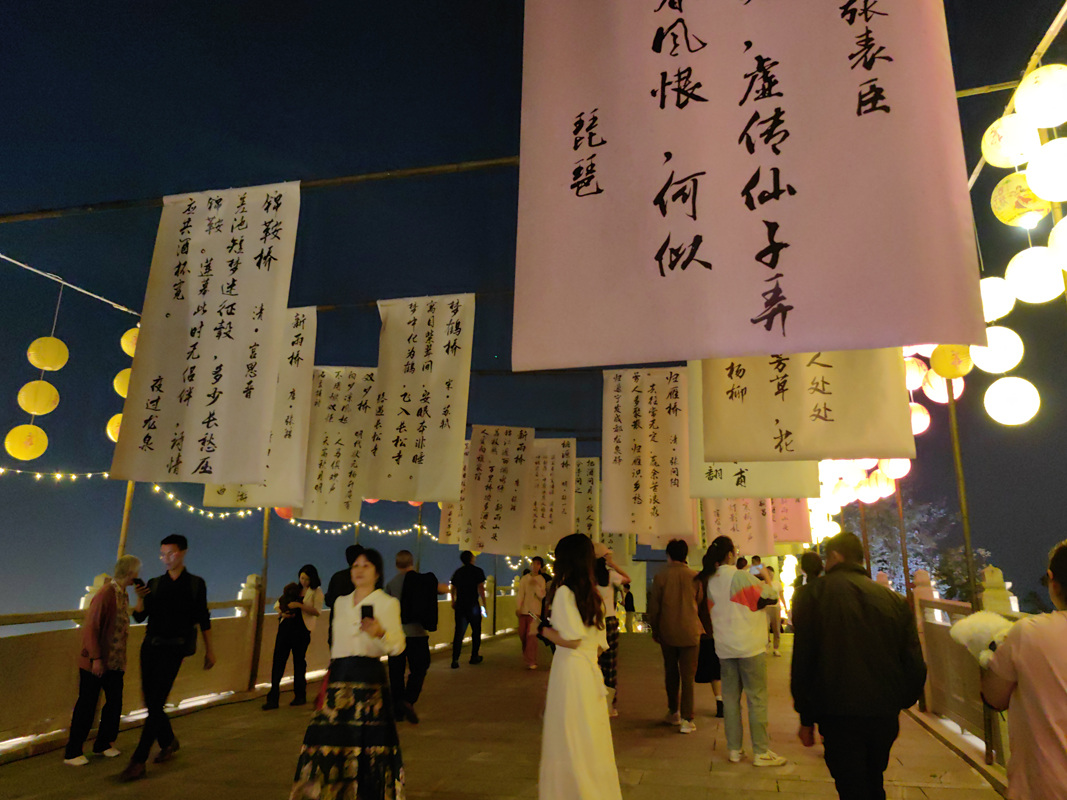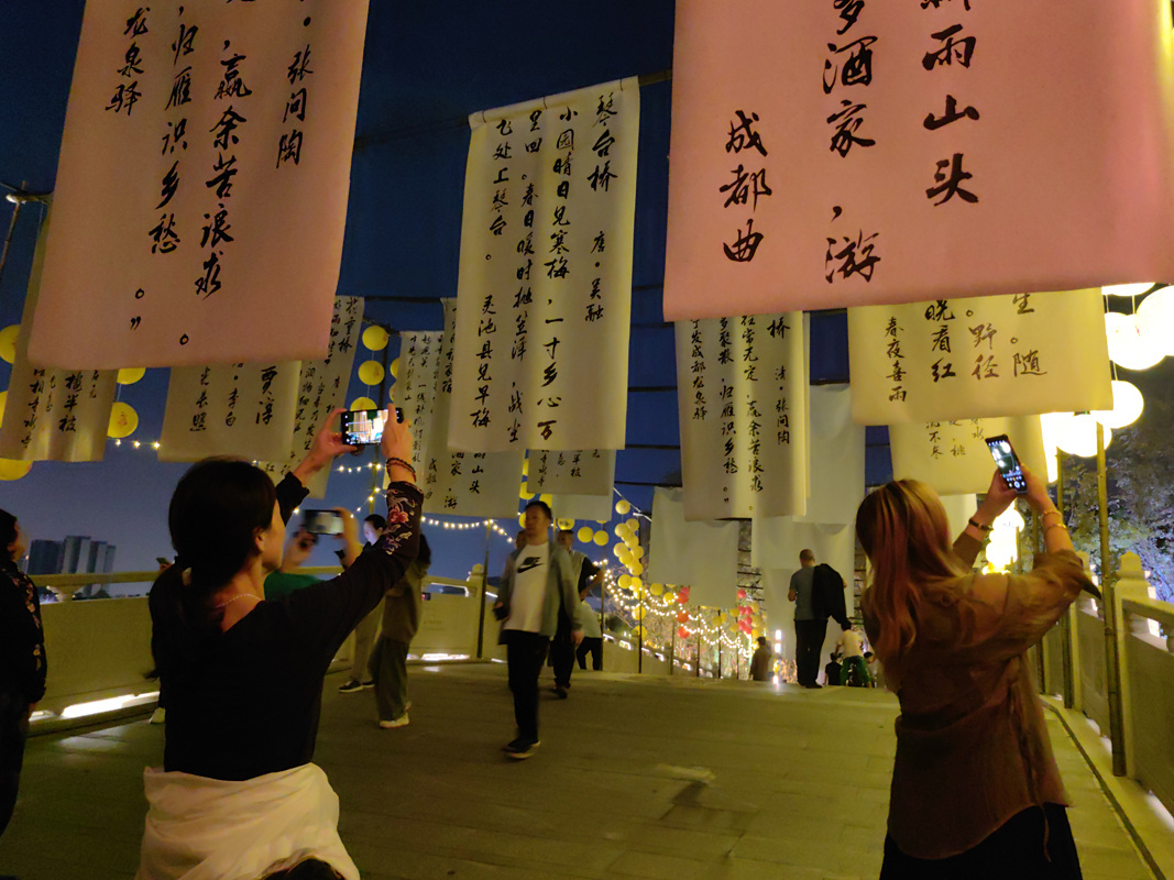 挂满灯笼的东安湖桃红桥、桃语桥、桃影桥,流光溢彩,灯笼上写着各种诗词;小径两边的桃花树上挂满了各种可以“发光”的诗词,引得市民在此流连忘返……实力宠粉的东安湖将“大唐不夜城”搬到了东安堤,全长超过1公里的场景布置,诗词、国风、汉服、川剧变脸、古筝弹奏等,一应俱全。来自各地的诗词爱好者们欢聚一堂,看着灯笼上的诗词,不由地大声吟诵,用诗歌表达对祖国、对家乡、对亲人的美好祝愿,也让路过的游人领略诗词的魅力,感受诗词的美妙。