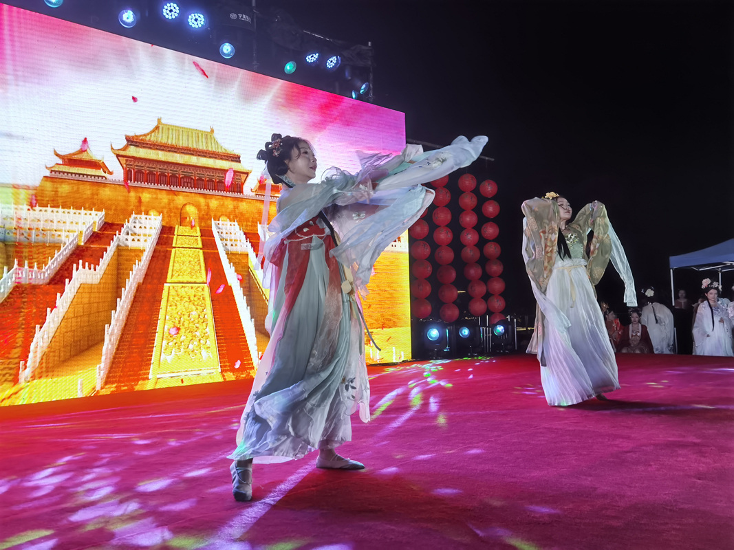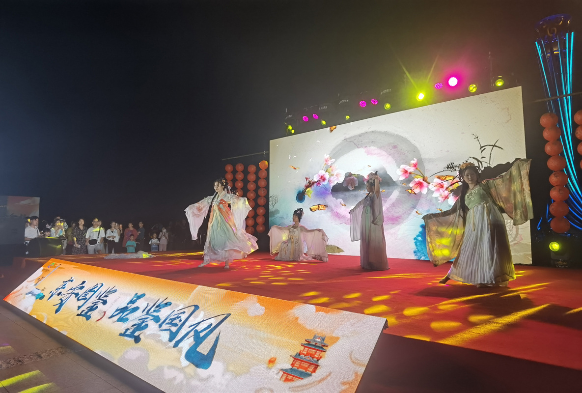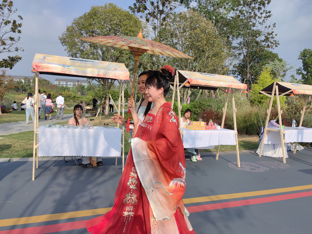 活动现场,民族乐器合奏《兰亭序》、群舞《双面霓裳丽人行》、箜篌伴舞《水调歌头》、双人舞《梦回大唐》、国风走秀《霓裳汉服秀》等精彩纷呈的活动表演,展示出了中国传统文化的自信与无穷魅力,赢得了现场观众的阵阵掌声。带着女儿来到活动现场的邹女士表示,在家门口就能体验到传统的汉服体验,她感觉非常有意义,而丰富多彩的活动也让自己近距离感受到中秋佳节的魅力。