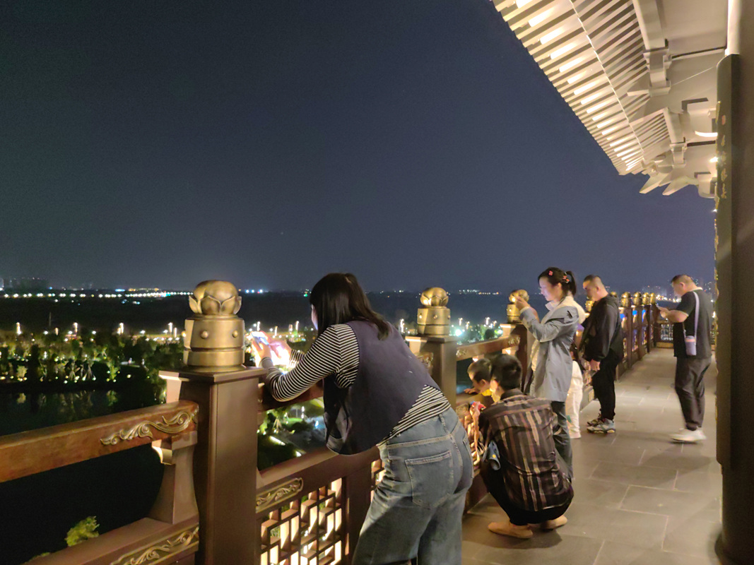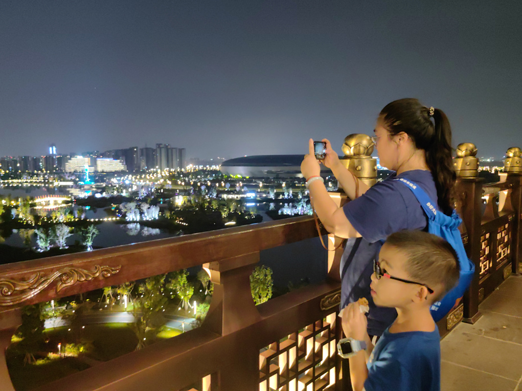 在东安阁,除了赏月,还能站在最高处以另一种角度打量公园与湖泊,一览东安湖的美景。“在东安湖这样的美景里赏月很美好,当清冷的光辉洒下来,落在我们的头顶身上,仿佛心也跟着变得澄明寂静了。”市民周新作一边说,一边让家人用手机定格她在东安阁望月的瞬间。