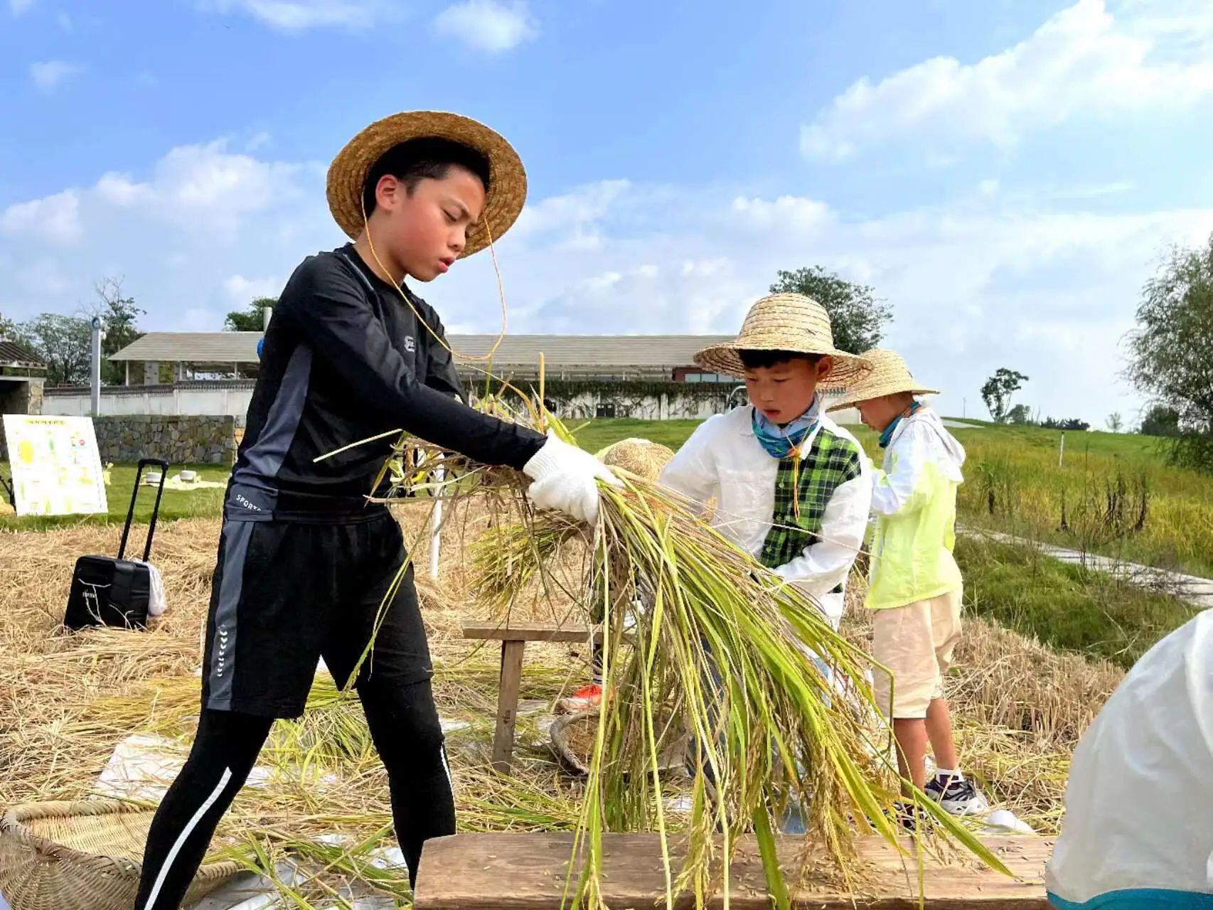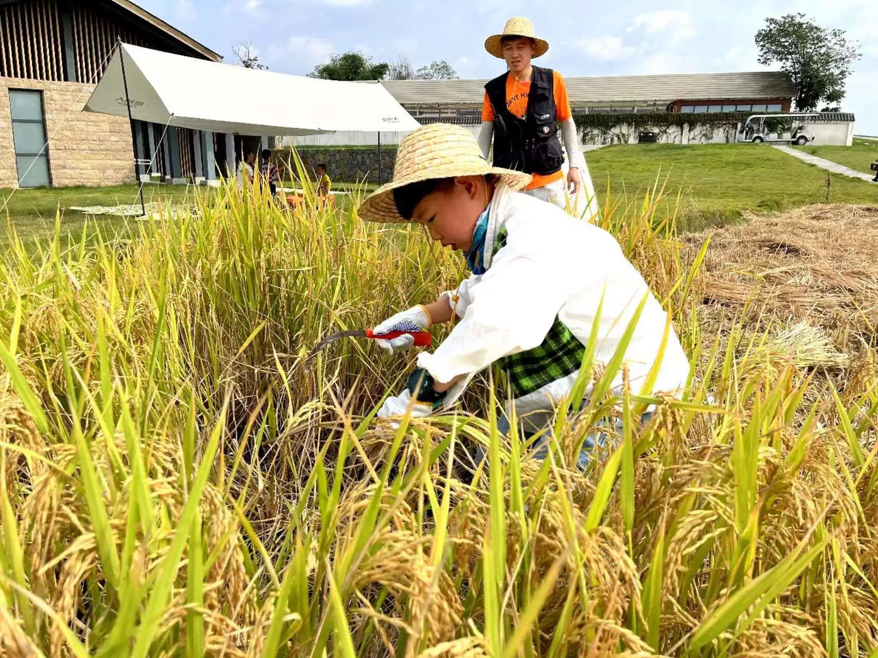 另一边,水稻收割体验活动也正在热闹进行中,沉甸甸的稻穗颗粒饱满,秋风轻拂,稻香四溢,空气中弥漫着果实和稻谷的芳香。割稻、捆扎、打谷……稻田里充满了欢声笑语,大人孩子们尽情在稻田里撒欢,感受田园生活。