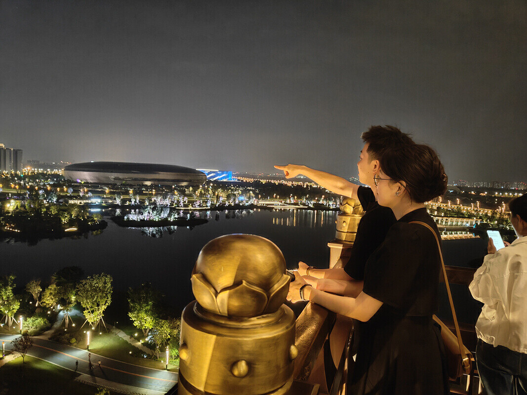 站上东安阁望月,你抬头,你望它,它也望你,清辉普照,如影随形。来自锦江区的蒋晓丽和家人登上东安阁,借着一轮明月许下美好愿景,共庆中秋佳节。“这还是我第一次来东安阁,这个建筑很美,修得很漂亮,今晚跟家人一起到这里来赏月,感受一次别样的中秋,感觉很棒。”蒋晓丽高兴地说,以后有机会还会和家人再来。