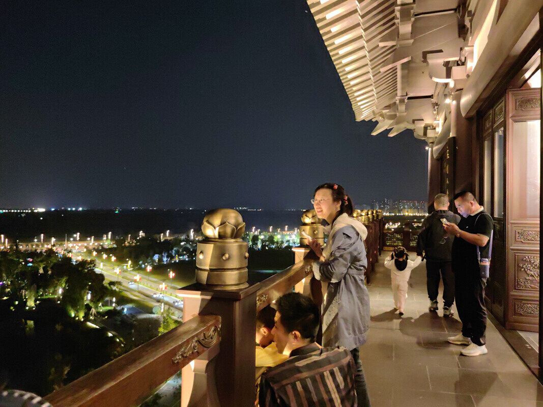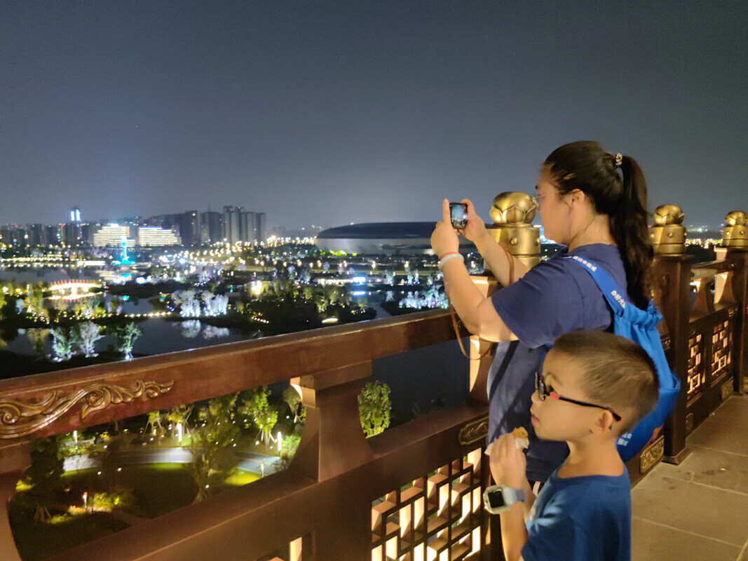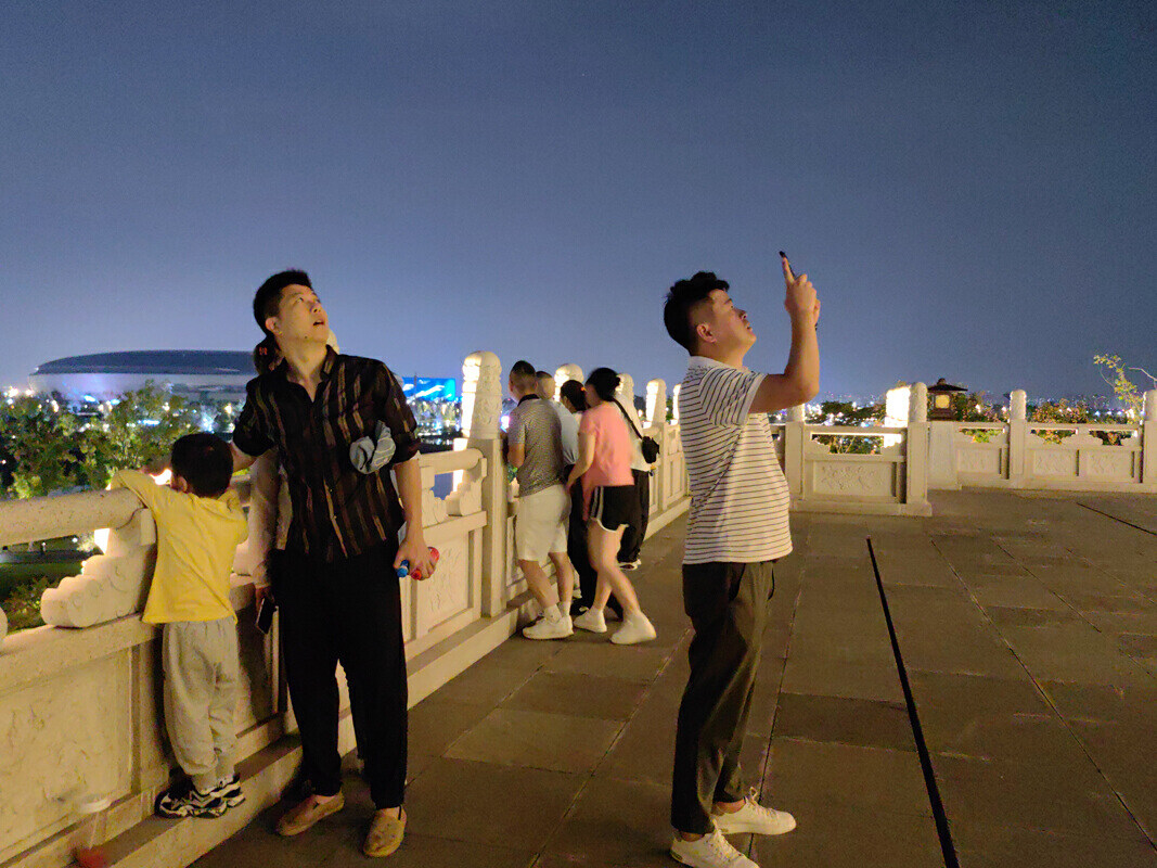 在东安阁,除了赏月,还能站在最高处以另一种角度打量公园与湖泊,一览东安湖的美景。“在东安湖这样的美景里赏月很美好,当清冷的光辉洒下来,落在我们的头顶身上,仿佛心也跟着变得澄明寂静了。”市民周新作一边说,一边让家人用手机定格她在东安阁望月的瞬间。