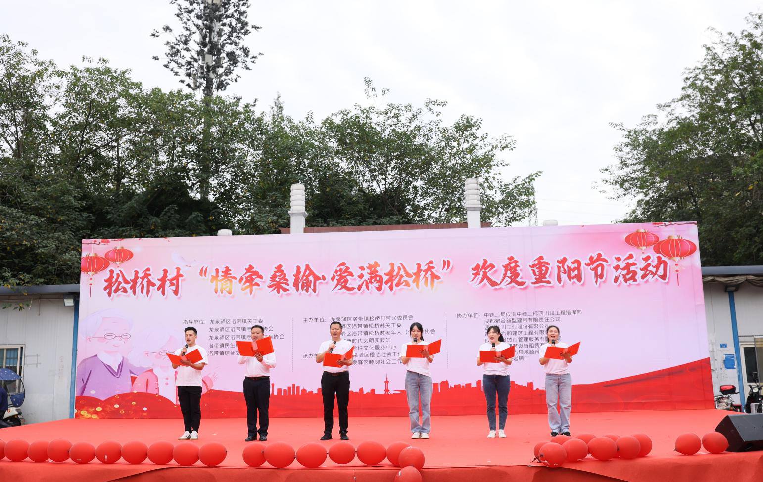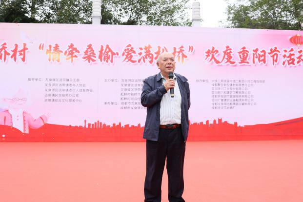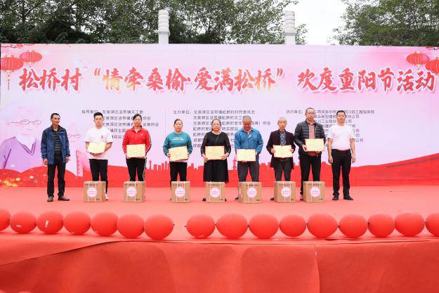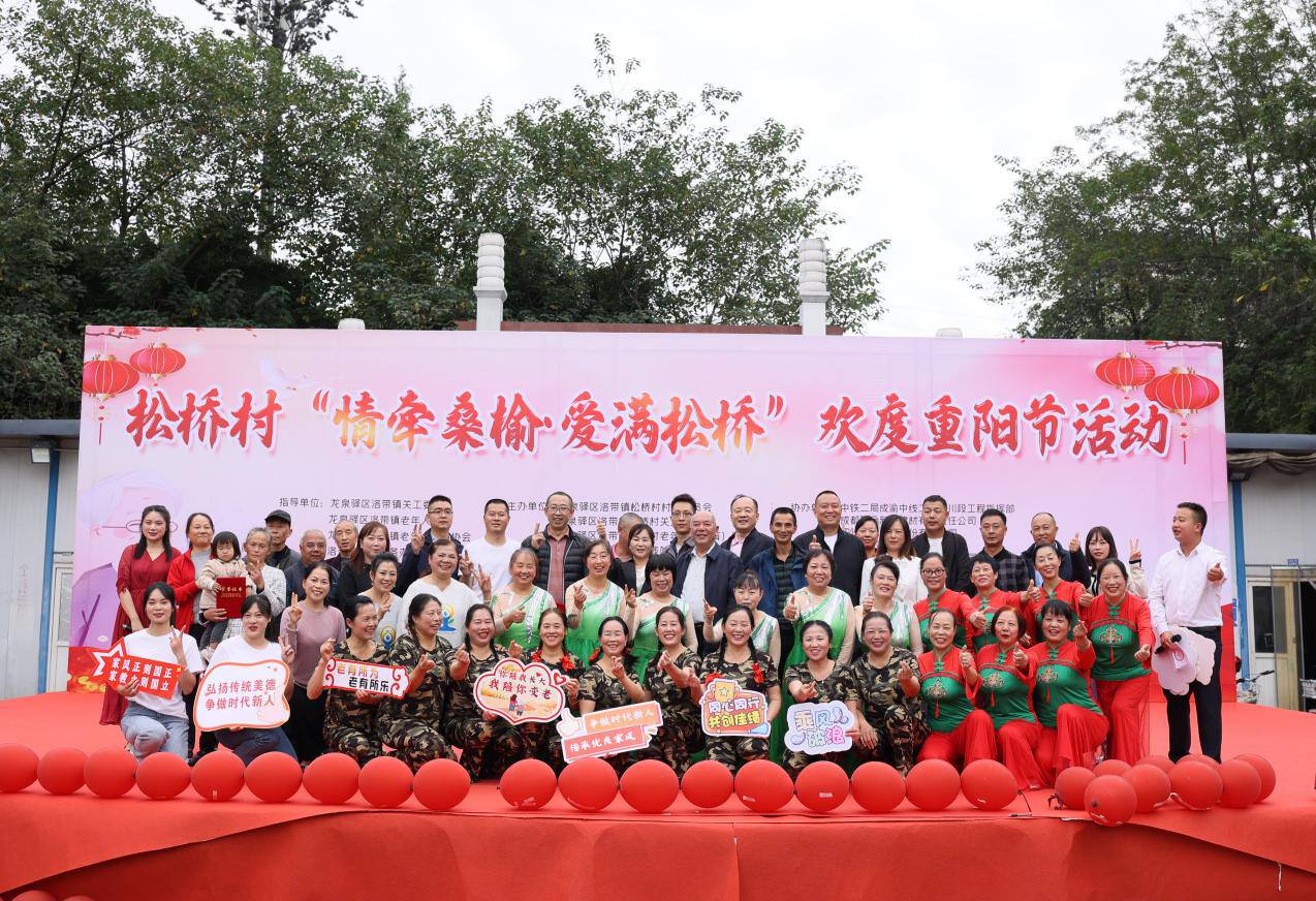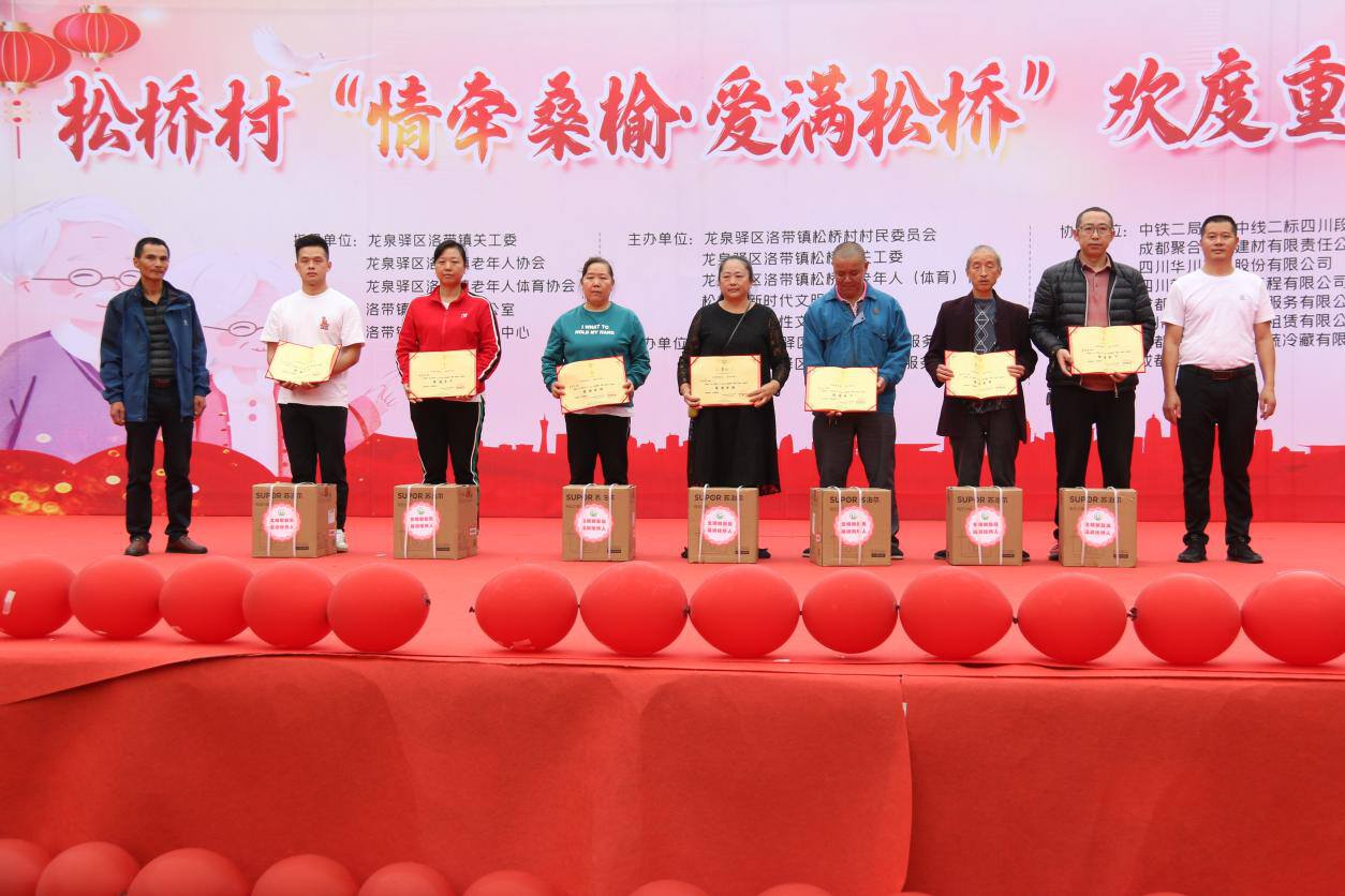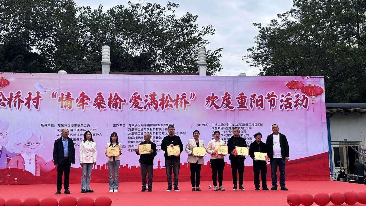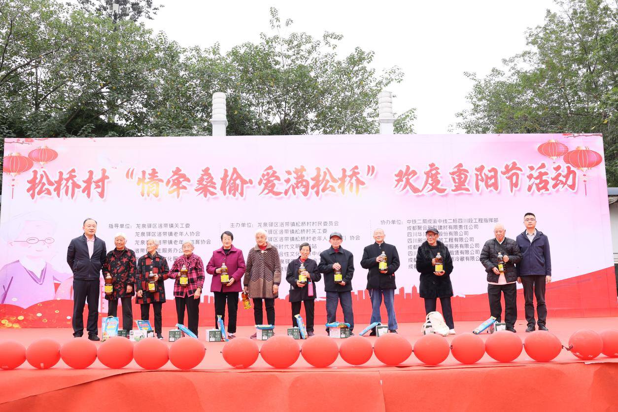 2023年10月20日,洛带镇松桥村联合中铁二局成渝中线二标四川段工程指挥部、成都聚合新型建材有限责任公司、四川华川工业股份有限公司、四川新六和建筑工程有限公司、成都环投城市管理服务有限公司、四川广誉建筑设备租赁有限公司、成都龙泉驿志程果蔬冷藏有限公司、成都金龙页岩砖厂等单位,于成都市龙泉驿区怡新广场携手举办“情牵桑榆·爱满松桥”欢度重阳节活动。以表彰、慰问、知识有奖问答,文艺表演等活动内容,为老年人等送去关心和祝福,进一步弘扬孝敬美德,发扬孝道文化。
