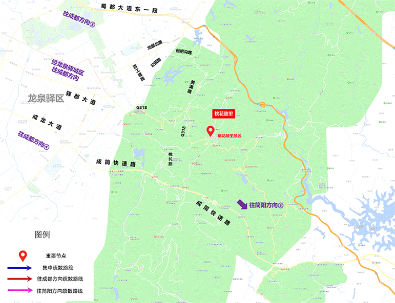 4.318国道(往龙泉驿方向)→318国道桃长路口→桃长路→成简快速路→成龙大道