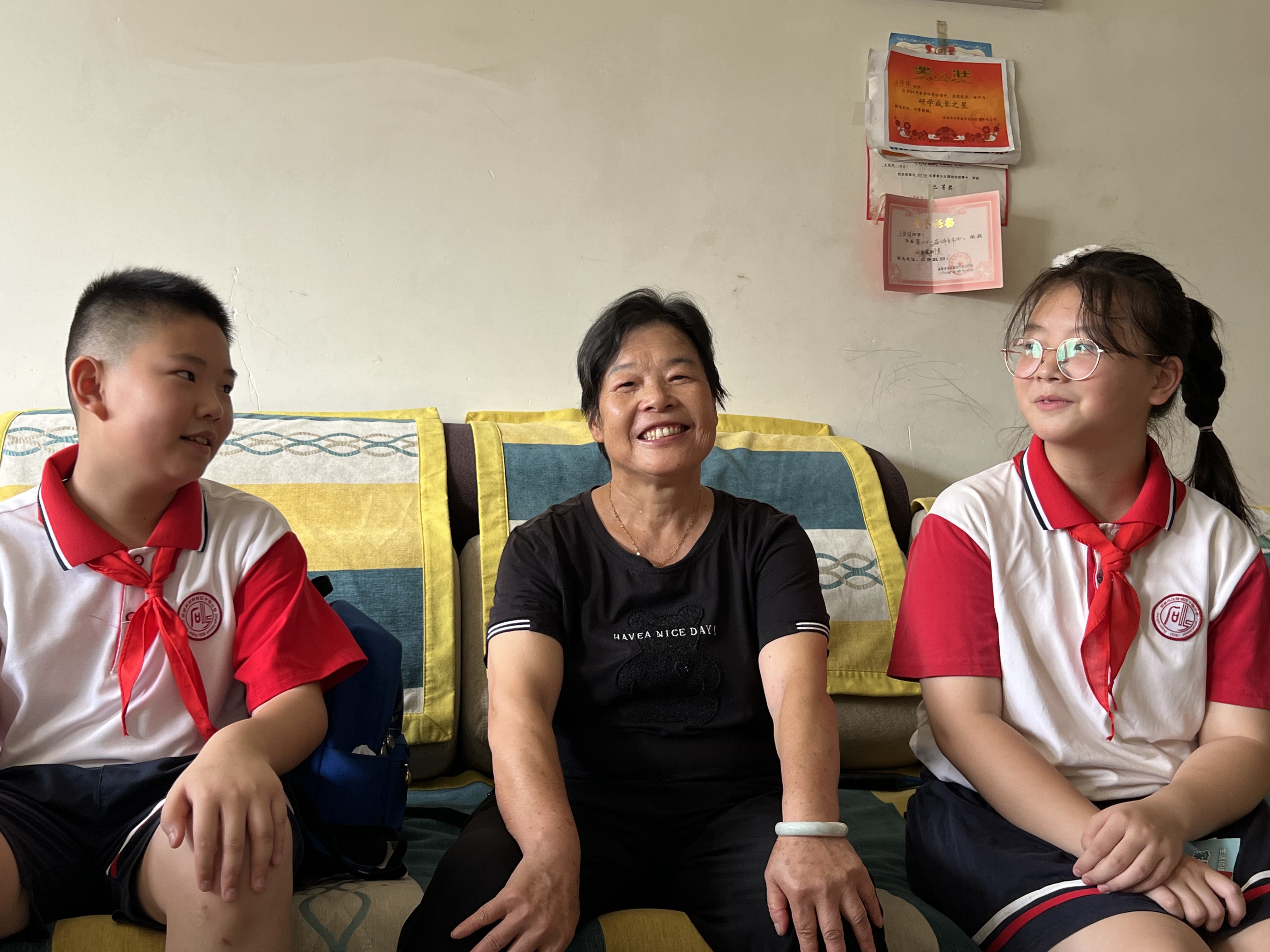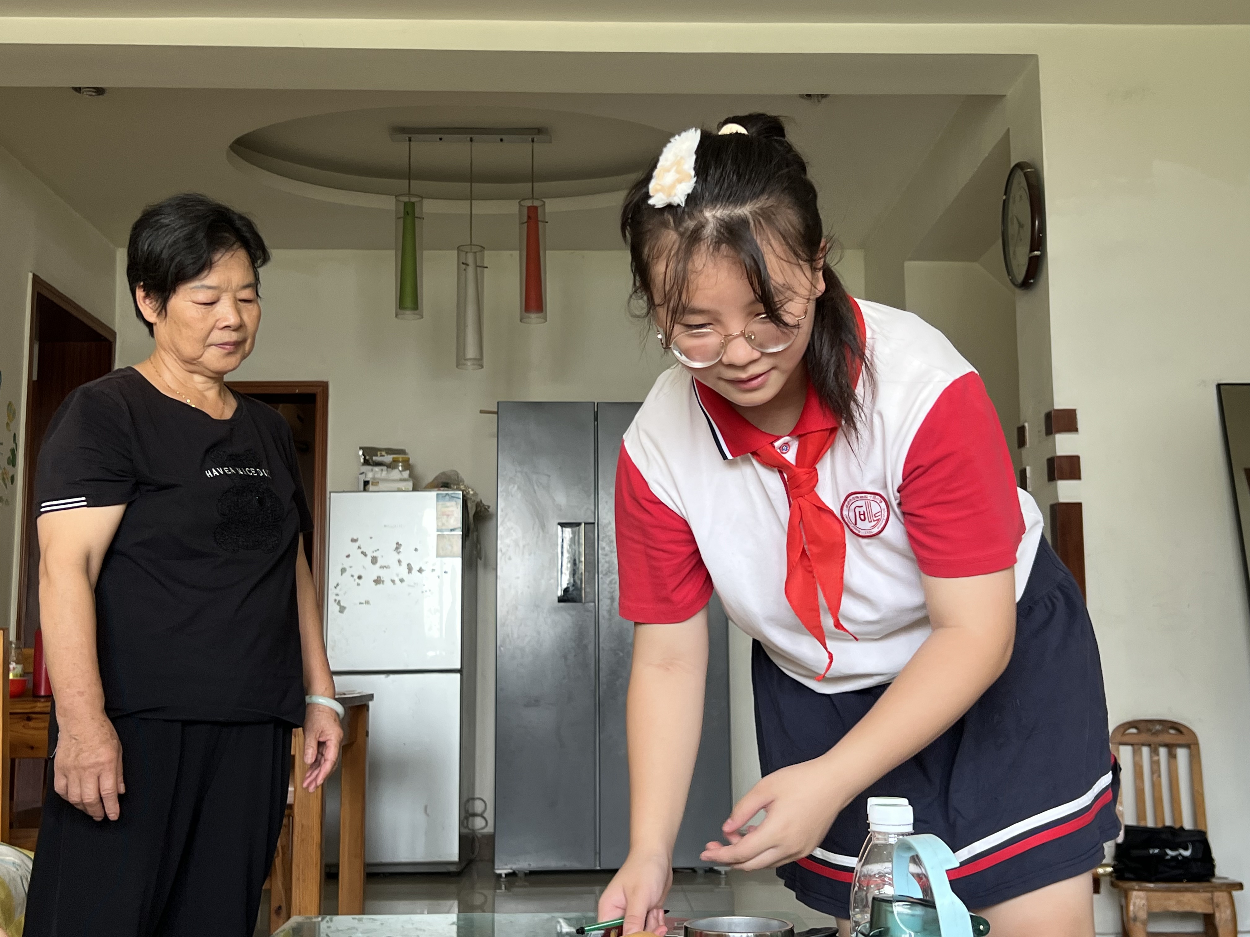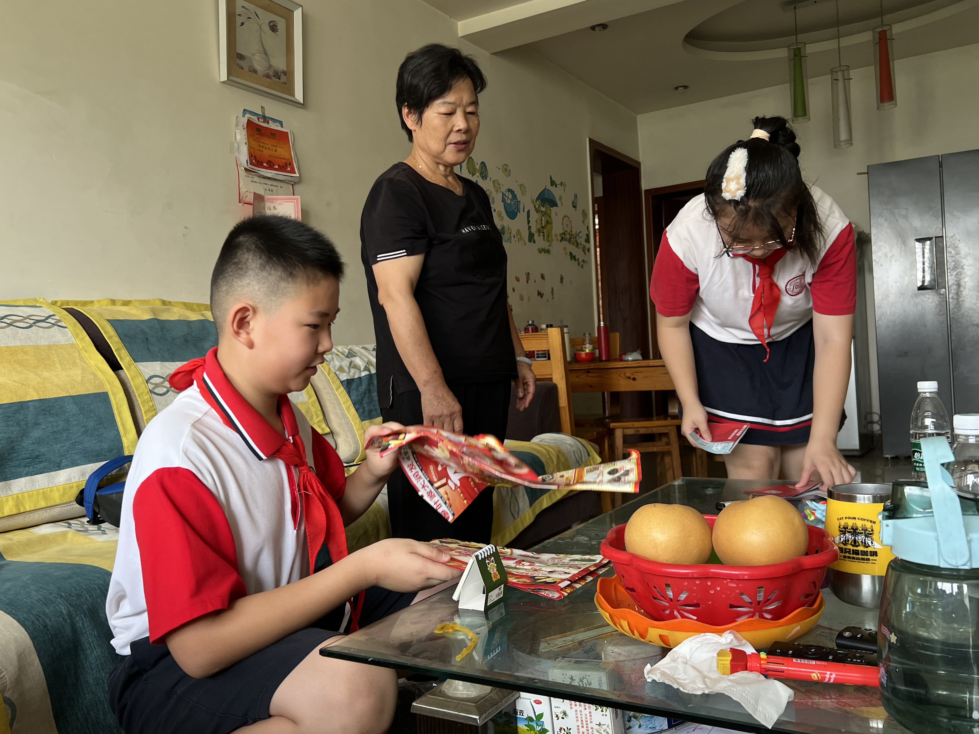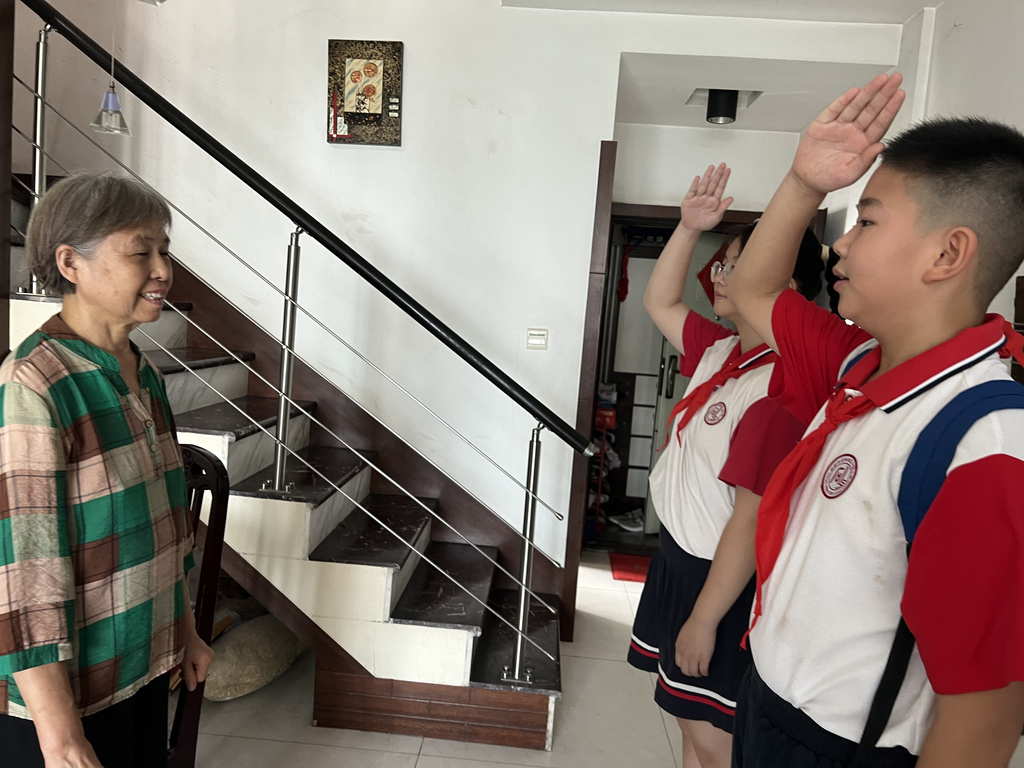 “我们是石灵社区的红领巾网格员,我叫蒋兴雷。我叫郑钰桐。”在石灵社区居民楼10栋,“红领巾网格员”们在社区网格员的带领下,敲开了辖区独居老人蒋婆婆的家门。小小网格员们帮助身体不便的蒋婆婆打扫房间、整理衣物。在同小区张婆婆家中,孩子们不仅打扫了卫生,还带着张婆婆的小孙女一起学习、玩耍。聊天时,两位活泼、机灵的“红领巾网格员”逗得张婆婆开怀大笑。