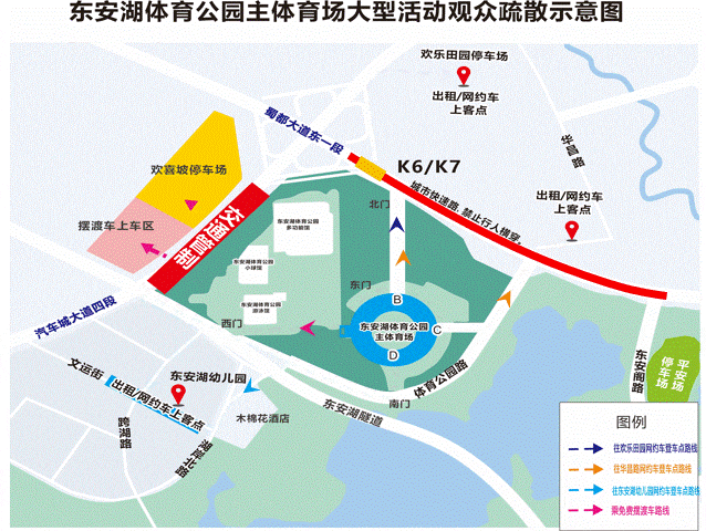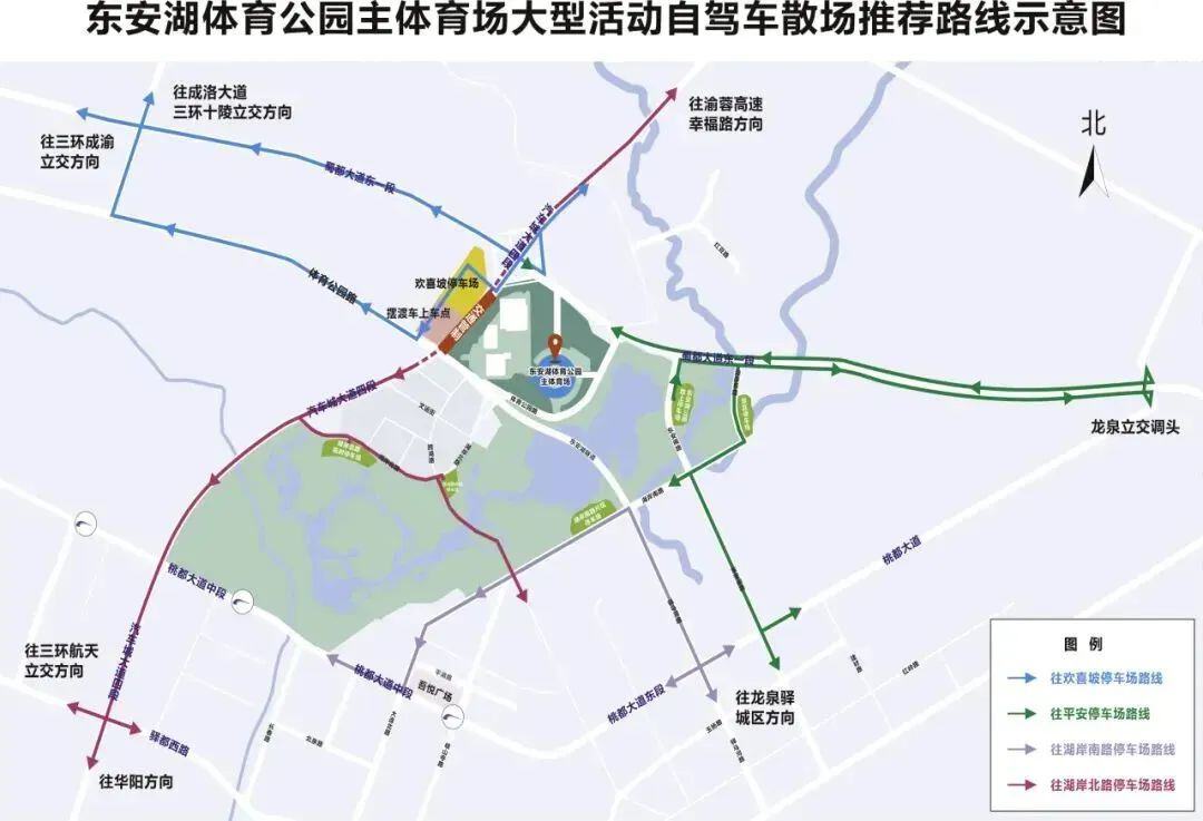 因散场时东安湖体育公园周边人车流量较大,请自觉服从现场交警和管理人员指挥,按照现场交通标志标识通行,共同维护交通秩序。汽车城大道体育公园路口进行交通管制时,需经路口往蜀都大道方向的车辆,可根据现场交警或者交通诱导牌指引驶入驿马河下穿隧道,经由桃都大道绕行。