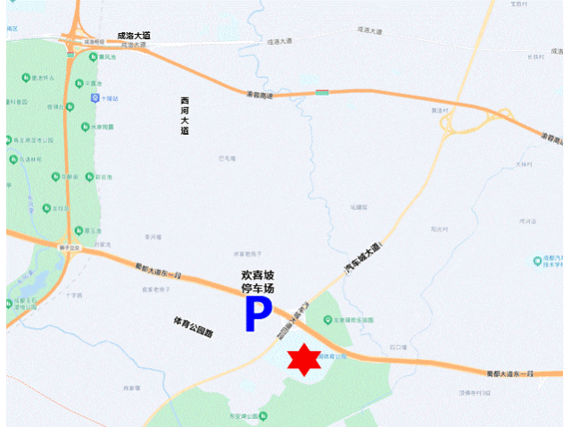 1、欢喜坡停车场:由成都方向自驾前往,遇蜀都大道出现拥堵时,建议经三环十陵立交→成洛大道→西河大道→体育公园路或经渝蓉高速龙泉驿收费站出站→汽车城大道抵达停车场。