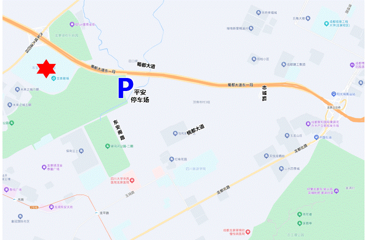 5、汽车城大道四段(龙兴路口以北)西侧辅道临时停车区:车头朝南,散场时车辆经汽车城大道→驿都大道或成龙大道疏散。