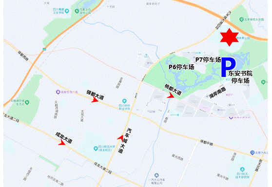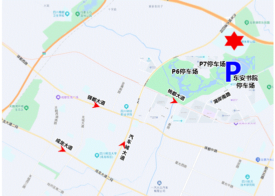 4、湖岸北路沿线停车场(P6、P7):由成都方向自驾前往,建议经三环航天立交→驿都大道→汽车城大道→湖岸北路抵达停车场,或经渝蓉高速龙泉驿出口→汽车城大道→湖岸北路抵达停车场。