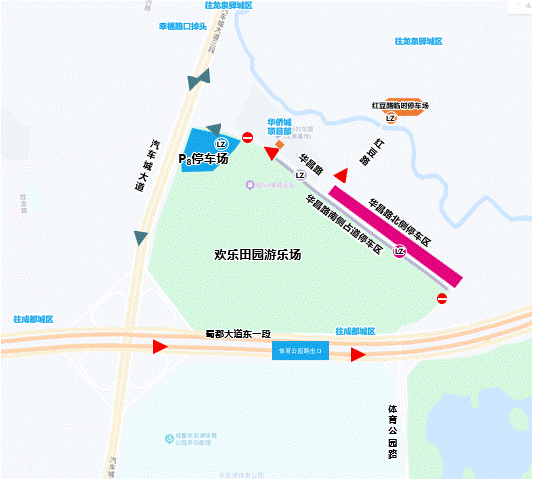 5、欢乐田园停车场:由成都方向自驾前往,建议经蜀都大道东一段→体育公园路→华昌路抵达停车场,或经蜀都大道东一段→幸福路→车城大道辅道抵达停车场。