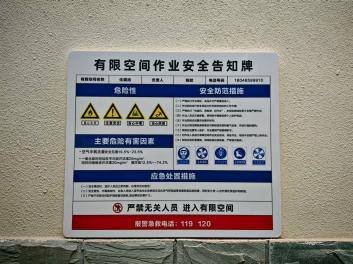 相关规范:《四川省有限空间管理规定》第十四条规定,生产经营单位应当在有限空间出入口等位置设置明显、规范的安全警示标志;在具备条件的场所设置安全风险告知牌,载明有限空间基本信息、单位紧急联系人、报警急救电话等内容。