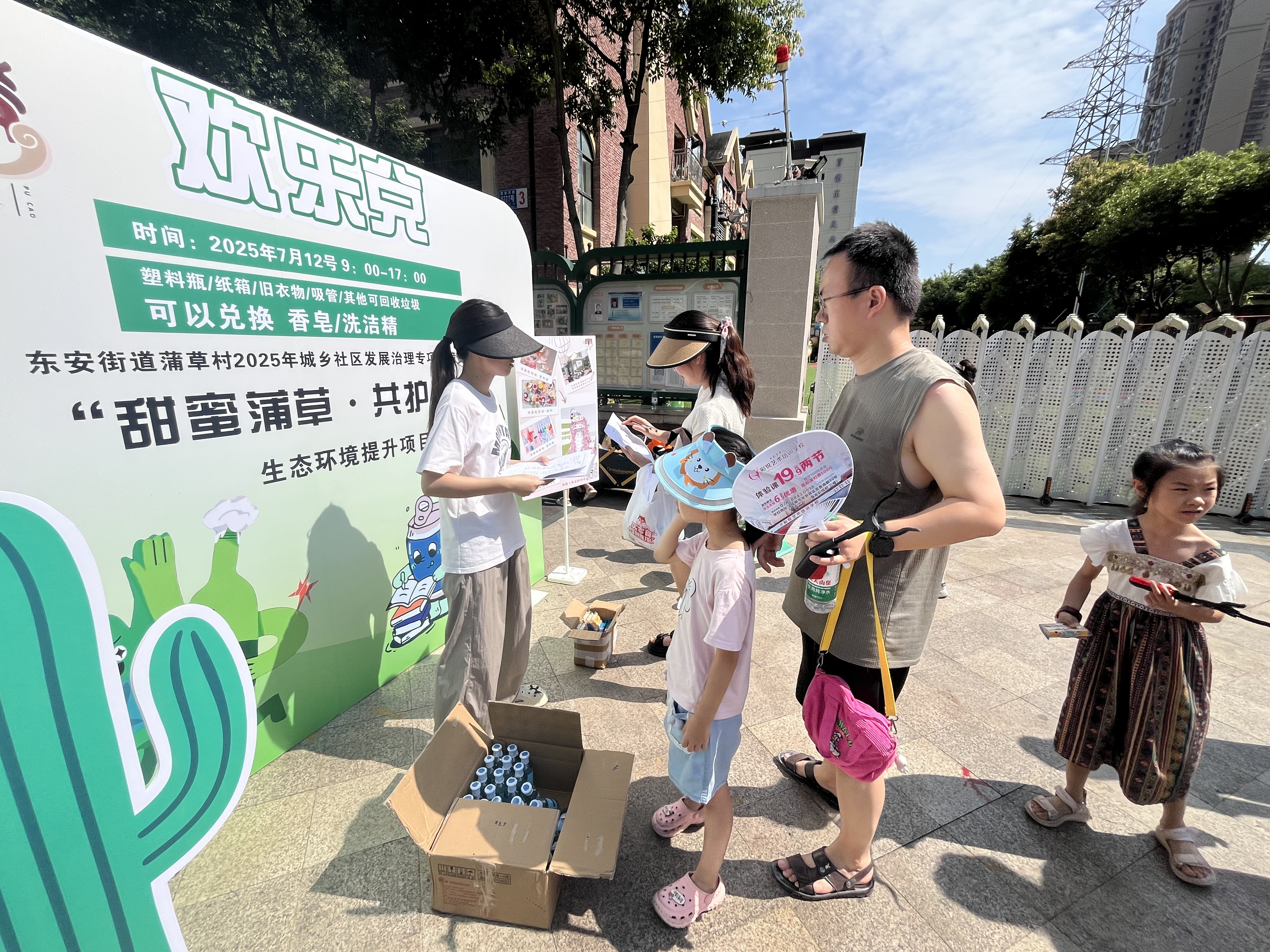 7月11日上午,蒲草村商业区与中国铁建国际城广场上,14组亲子家庭化身“环保先锋队”,手持捡拾夹与回收袋穿梭于商圈街巷。孩子们专注捡拾纸屑、塑料等垃圾,更主动向商户与居民宣传:“7 月下旬我们要建旧物体验馆,您家的塑料瓶、旧衣物都能变宝贝!”3小时的“商圈清洁行动”,不仅让商圈角落焕新颜,更让“随手分类、主动回收”的意识随脚步蔓延。