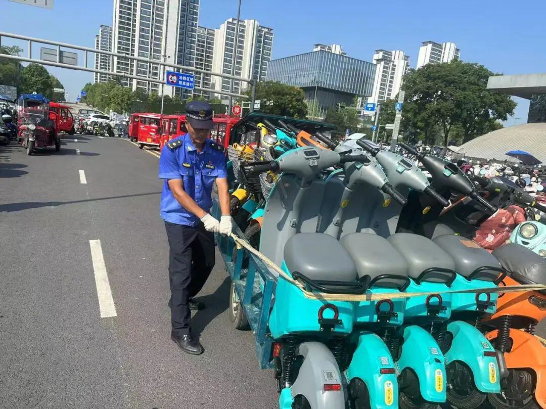 曾经,早高峰的这里是共享单车的“重灾区”,500余辆共享电瓶车如潮水般涌来,堆积成山,让出站的居民仿佛在玩“跳格子”,连盲道都被侵占。而如今,经过分水社区城管分队队员们的努力,站外非机动车堆积量从峰值500余辆降至划线区内100%规范停放。