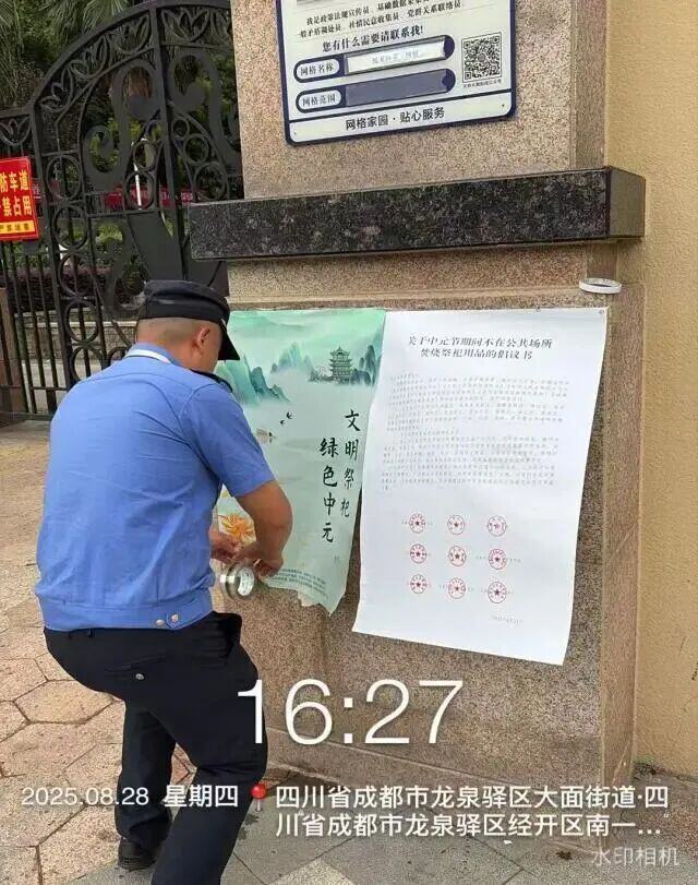 又是一年中元至,慎终追远寄深情。为守护城市洁净环境、筑牢安全防线,切实将“文明祭祀”理念融入传统节日,大面街道紧扣2025年“中元节”工作要求,自9月2日起,每日17时至23时,街道全面启动“中元节”文明祭祀专项行动,用扎实举措让传统节日更具文明温度。