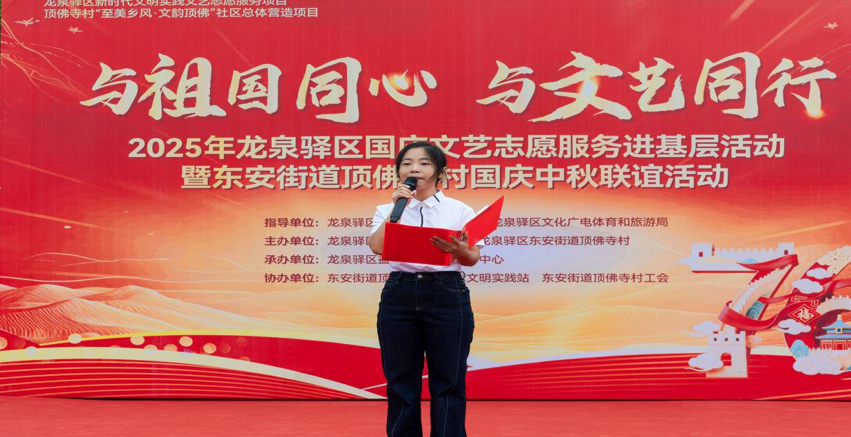 9月27日,在龙泉驿区文联的指导下,区文艺志愿者协会与东安街道顶佛寺村携手,在顶佛寺村文化广场隆重举办“与祖国同心 与文艺同行”庆国庆文艺志愿服务进基层活动。这场经过精心筹备的文化盛宴,吸引百余名村民到场参与,让大家在欢声笑语中提前感受国庆佳节的浓厚氛围。