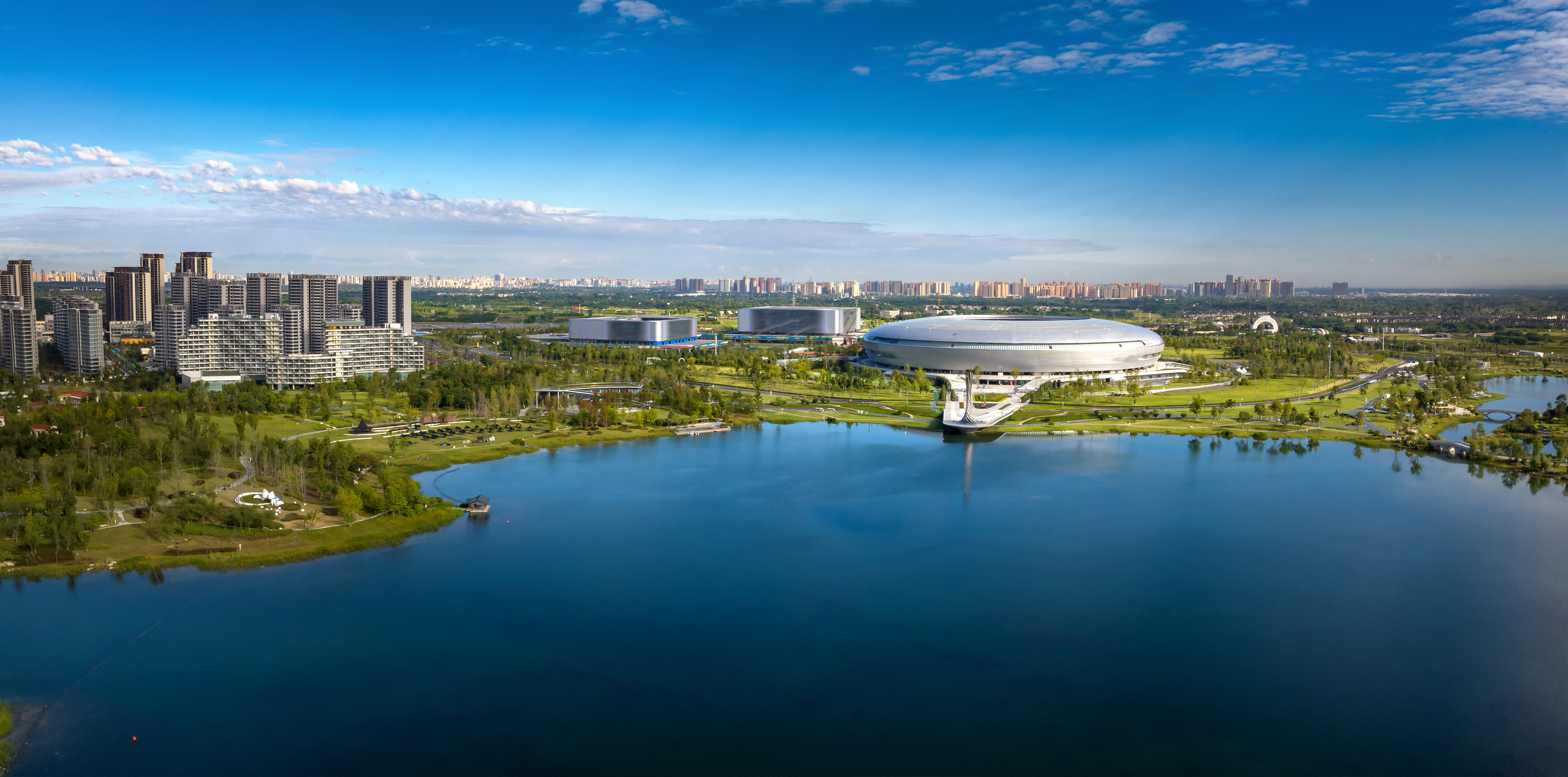 作为大运会的主会场,主体育场犹如一只巨大的银色“飞碟”停靠在东安湖的湖面之畔,与远处的城市和雪山相映生辉。远山绿水、城市人家,这幅人与自然和谐共生的画面,伴随着成都大运会开幕式的精彩留在人们心中。