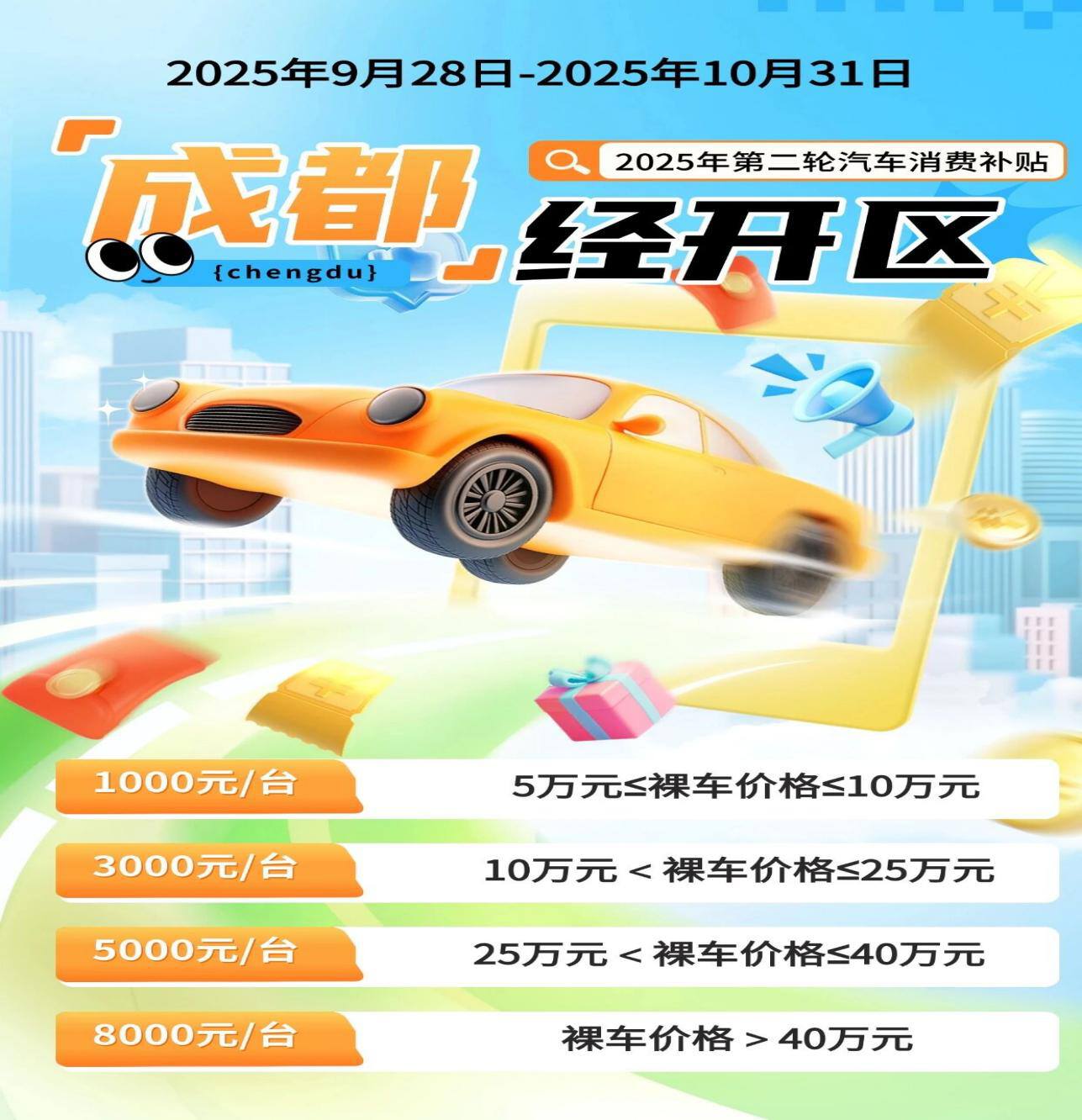 想买车的朋友注意!龙泉驿区新一轮汽车促消费补贴活动已启动,10月31日就截止。900万元补贴直接减,5万(含)-10万(含)补贴1000元、10万元-25万元(含)补贴3000元、25万元-40万元(含)补贴5000元、40万以上补贴8000元,四档福利帮你省下真金白银。