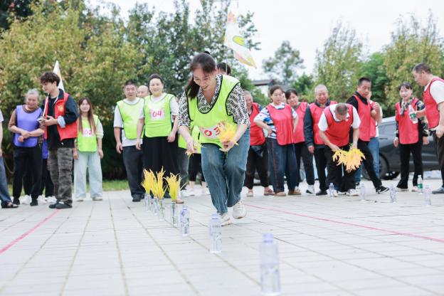 运动竞技区,14个村民组组建6支“丰收战队”,项目源自村民“农耕记忆”诉求:“网格同心”旱地插秧赛拼速度与协作,喻指共担网格事务;“丰收果实运输”赛用簸箕、“网格传导管”传苹果,将农活变协作竞技;“秋收拔河”赛上,老党员喊号、年轻人发力、村民助威,气氛热烈。
