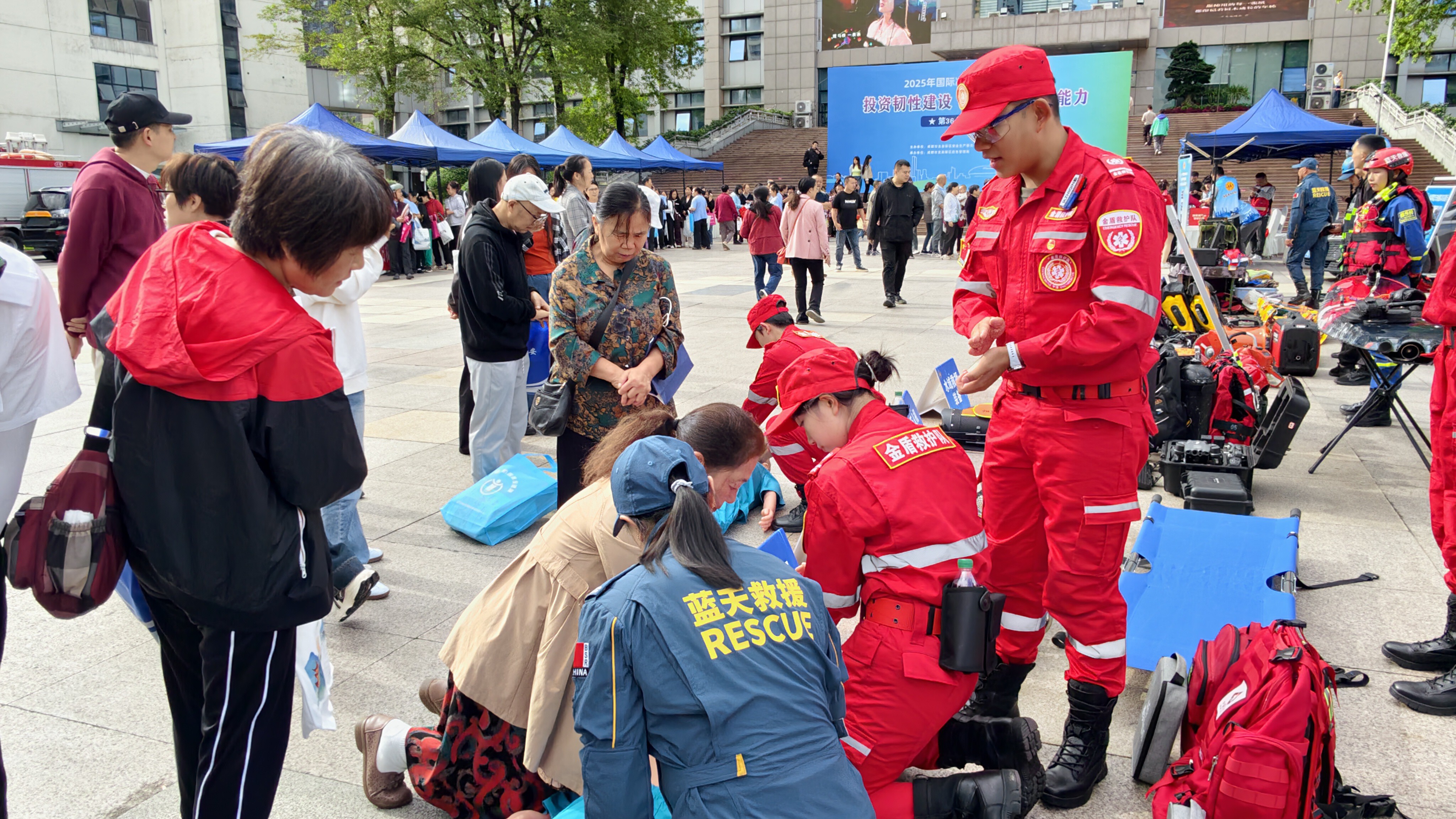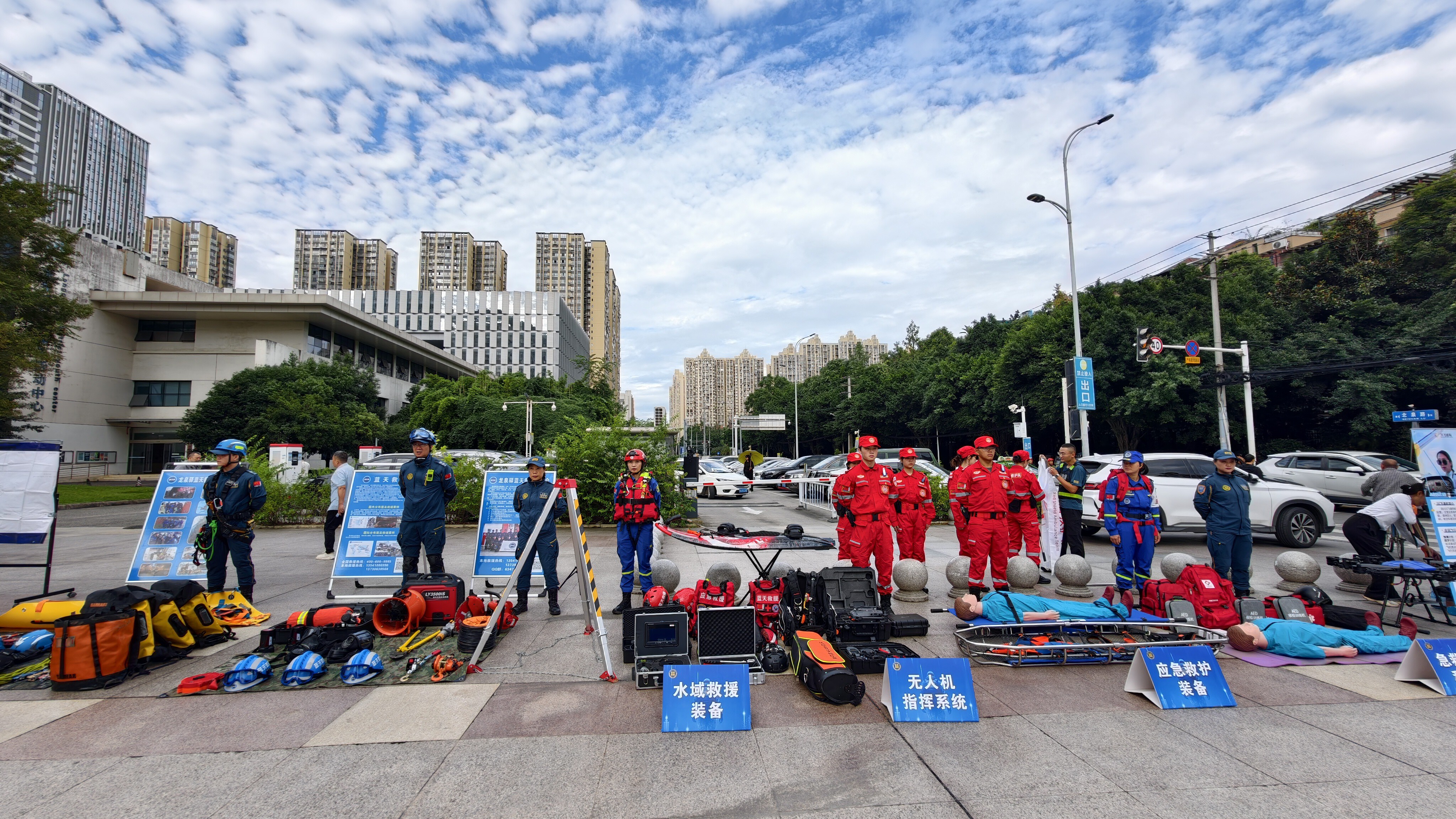 在知识问答热烈开展的同时,龙泉驿区蓝天救援队的专业支持成为活动另一大亮点。救援队在现场设置装备展览区,水域救援设备、高空救援器械、应急救护装备、山地绳索装备等专业工具整齐陈列,直观展现不同灾害场景下的救援装备应用。不少市民驻足观看,不时向队员提问,对专业救援工作有了更清晰、更深入的认识。