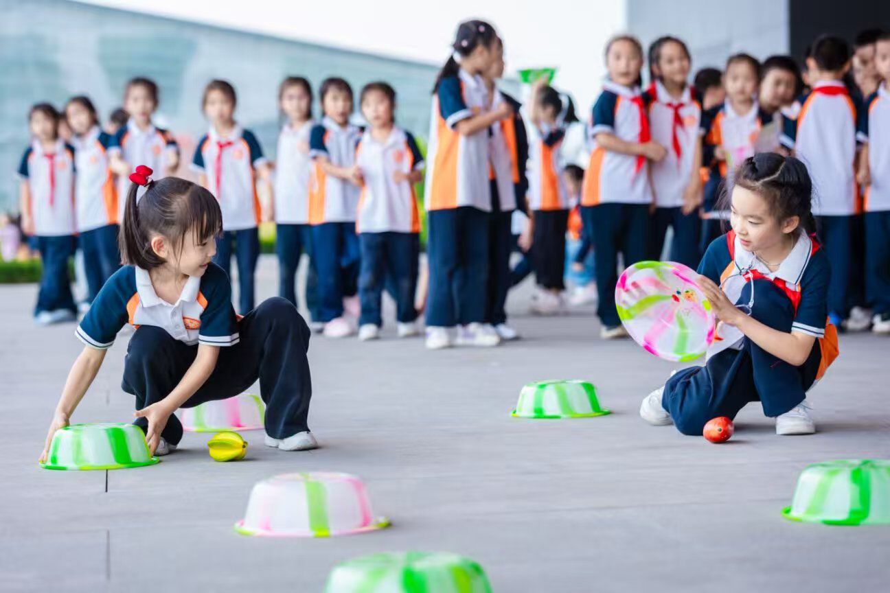 一楼的户外场地,趣味运动会正在火热上演。新龟兔赛跑中,孩子们扛着巨型道具,在口号声中齐步向前;抢滩登陆考验着团队的战术与速度;水果连连看则是对记忆与反应的终极挑战。秋日天光为场地镀上一层柔和的底色,孩子们跃动的身影,是其中最灵动的笔触。