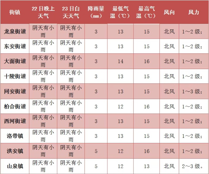 22日晚上到23日白天阴天有小雨,气温13~15℃;