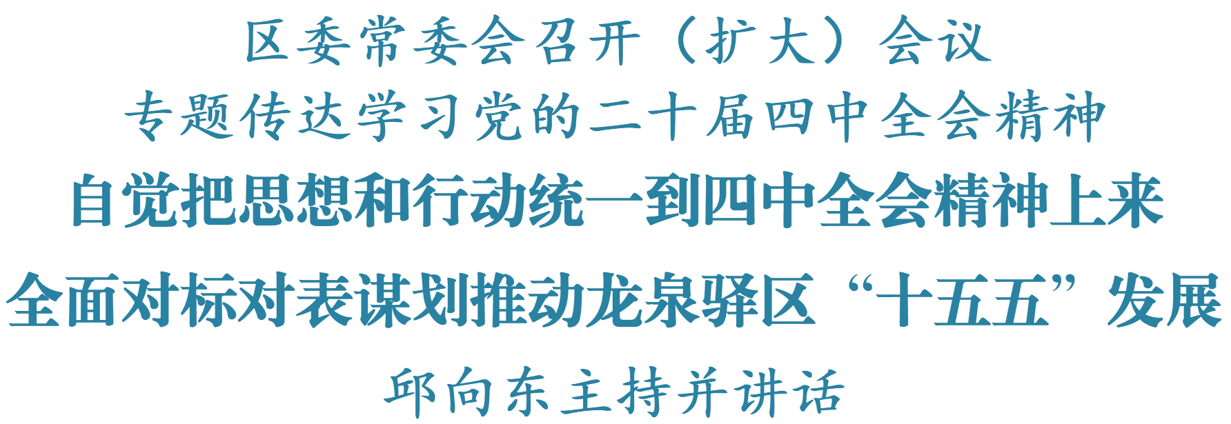 会议强调,党的二十届四中全会是在我们党团结带领全党全国各族人民以中国式现代化全面推进强国建设、民族复兴伟业的关键时期召开的一次十分重要的会议,意义重大、影响深远。习近平总书记在全会上所作的工作报告和重要讲话,全面总结了党的二十届三中全会以来党和国家各项事业取得的新进展新成就,深刻阐明了事关“十五五”时期经济社会发展的一系列重大问题,对贯彻落实全会精神、做好各方面工作提出了明确要求,具有很强的政治性、思想性、战略性、指导性,为做好当前和今后一个时期工作提供了根本遵循。全会审议通过的《中共中央关于制定国民经济和社会发展第十五个五年规划的建议》,准确把握“十五五”时期党和国家事业发展所处历史方位,深入分析我国发展面临的深刻复杂变化,对未来五年发展作出顶层设计和战略擘画,为做好“十五五”时期各项工作、开创中国式现代化建设新局面提供了科学指南。我们要自觉把思想和行动统一到党的二十届四中全会精神上来,全面对标对表谋划推动龙泉驿区“十五五”发展,不折不扣推动中央和省委、市委各项决策部署在龙泉驿区落地生根、开花结果。