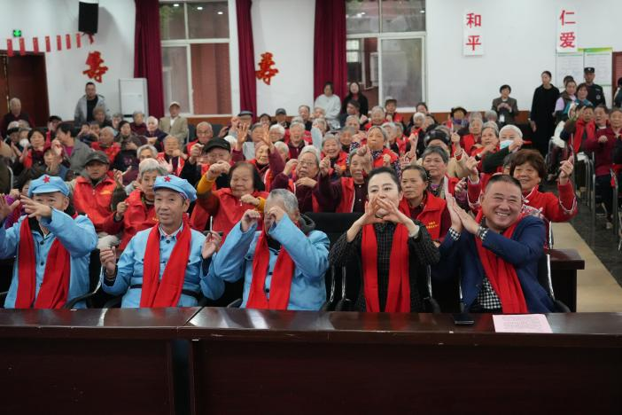 一段特别的手语操互动环节引发了全场共鸣。志愿者们用手语传递出“无声胜有声”的关怀。老人们围坐台下,有的跟着比划手势,有的专注凝视,脸上洋溢着幸福的笑容。一位老人感慨地说:“这样的表演让我们觉得特别亲切,就像家人一样。”
