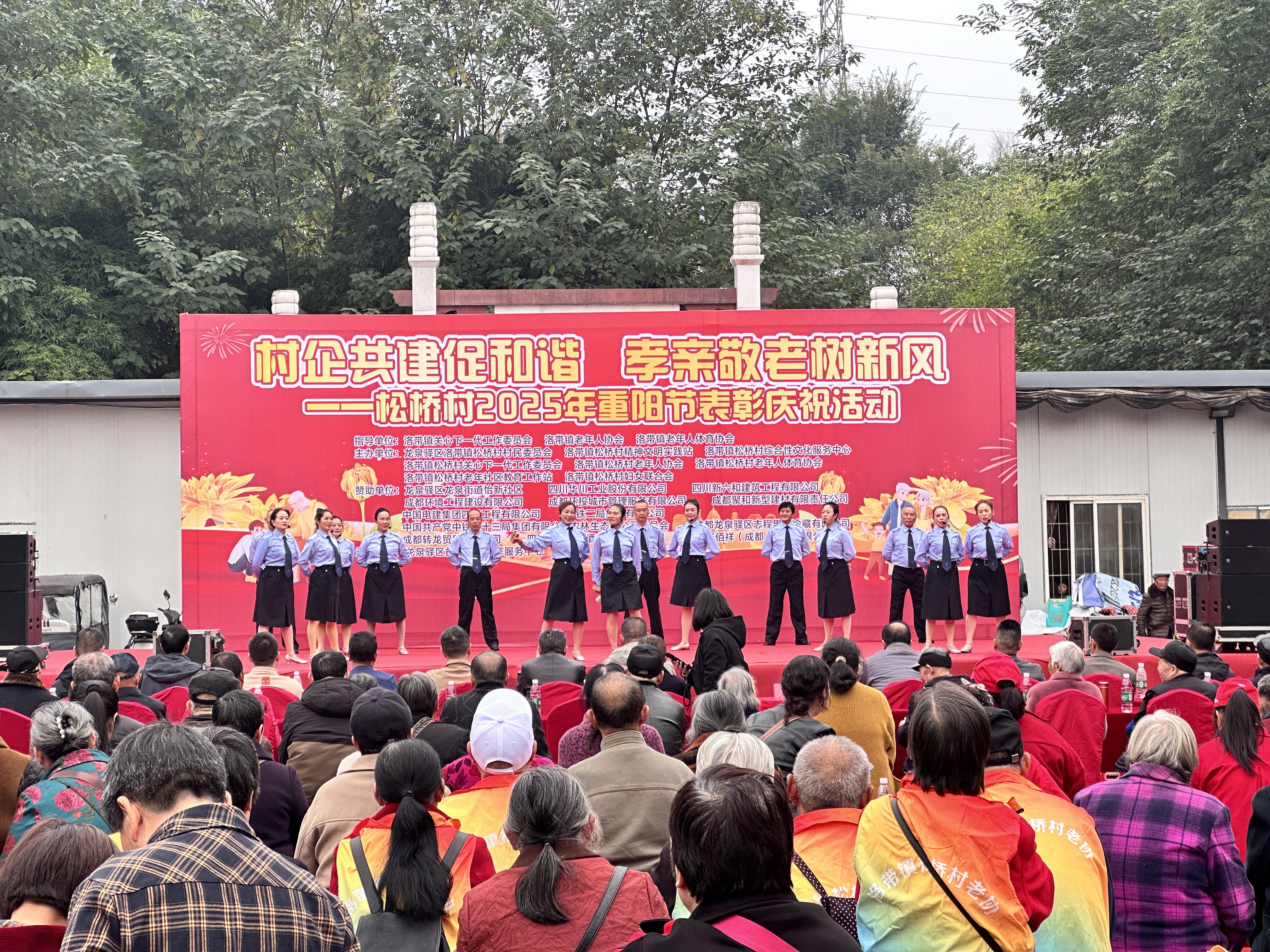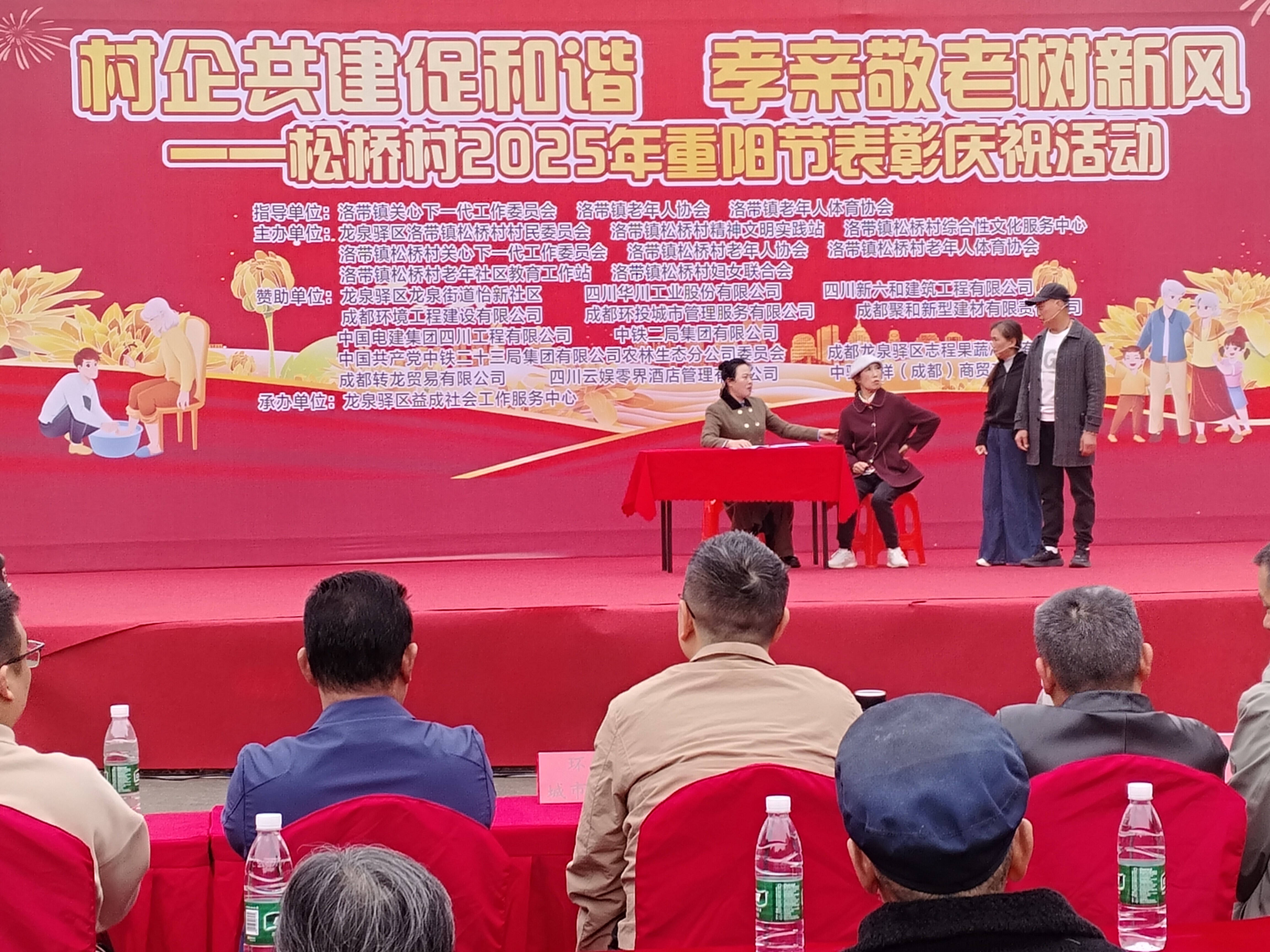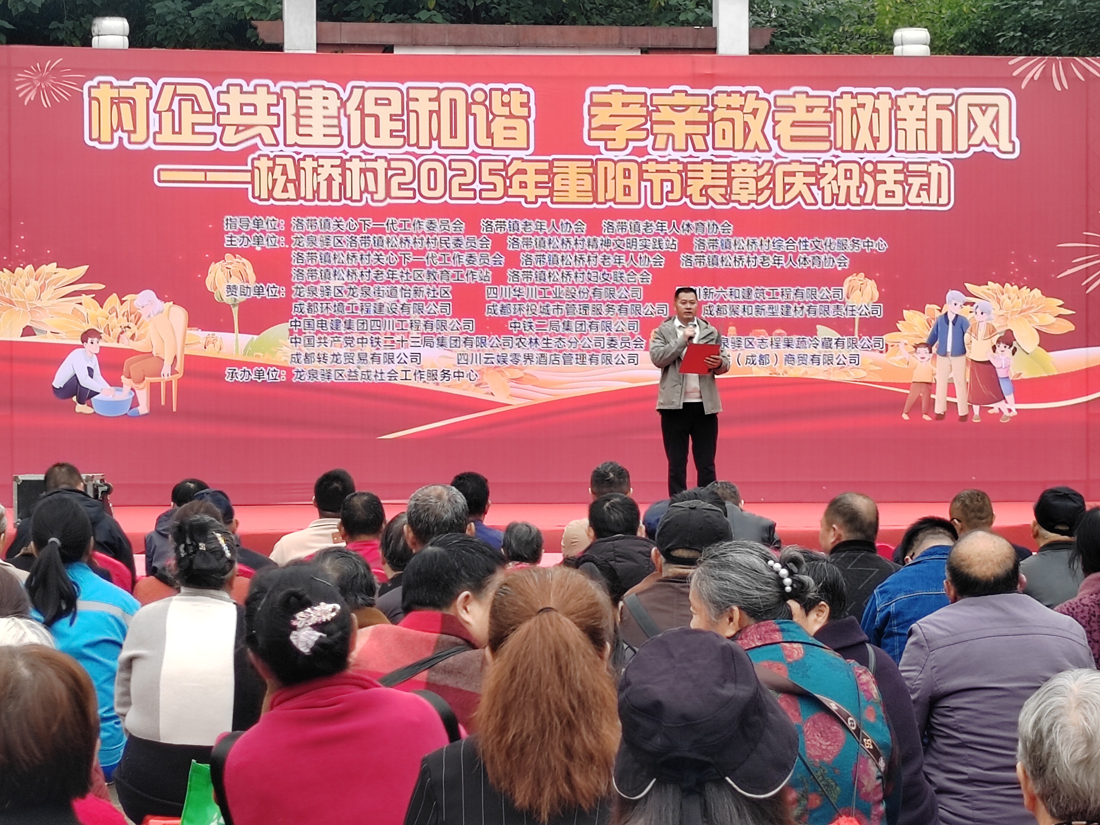 岁岁重阳,今又重阳;金秋送爽,敬老情长。为传承尊老敬老的中华传统美德,涵养新时代文明乡风,10月29日下午,洛带镇松桥村在龙泉街道怡新广场举办了一场以“村企共建促和谐·孝亲敬老树新风”为主题的重阳节表扬庆祝活动。活动以温情为底色、以文化为纽带,既为全村老人们送上了满满的节日祝福,也给乡村振兴注入了实实在在的温暖力量。
