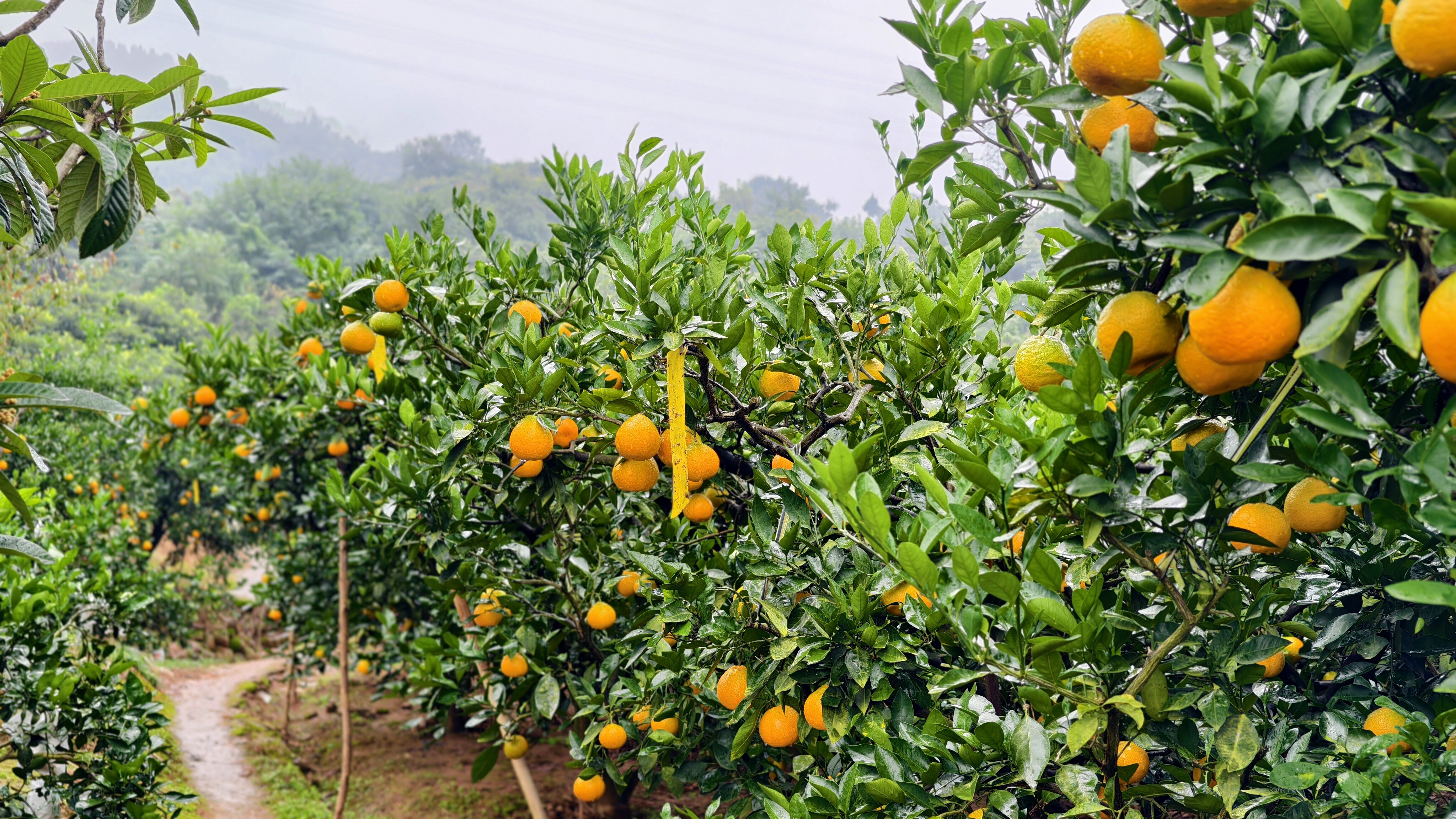 10月31日上午,薄雾未散,细密的小雨悄然浸润着龙泉山,在龙泉驿区柏合街道南山村的柑橘园里,橙黄色的柑橘缀在翠绿枝条上,随着微风轻轻晃动,晶莹的水珠顺着果皮滚落,光是看着就让人食欲大开。眼下,南山村千余亩柑橘正陆续成熟,从山坡到平坝,连片的橘园里满是橙黄翠绿的交织,处处都是“丰收的甜蜜”。