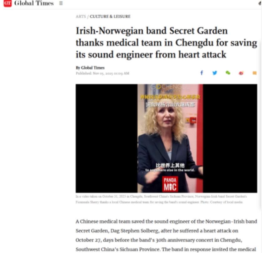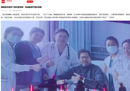 “是你们的专业与温暖,让生命得以延续,让音乐再次唱响。”在“神秘园”乐团成都巡演的舞台上,小提琴家菲奥诺拉・雪莉代表其伙伴的哽咽致谢,背后是龙泉中医院医疗团队与死神赛跑的48小时。乐团成员突发急危重症,医院迅速启动“双语急救绿色通道”,中西医专家联合会诊形成“精准救治 + 整体康复”的闭环方案,最终让患者转危为安。