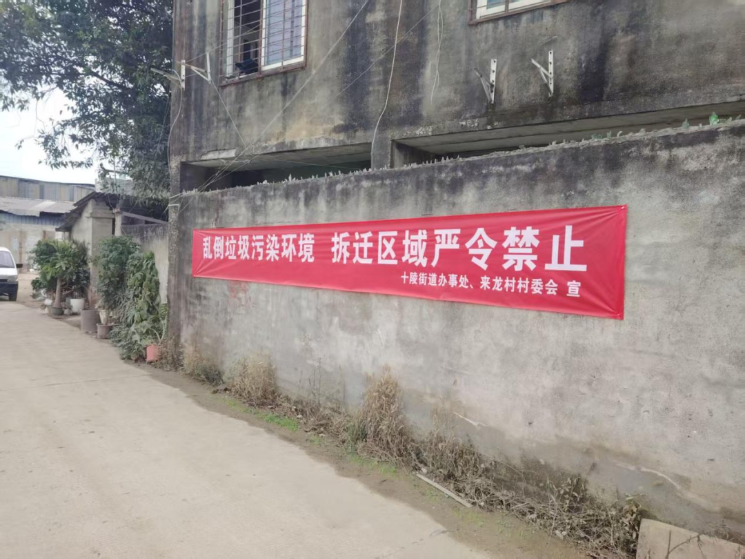 整治伊始,十陵街道工作人员精准发力,在来龙拆迁片区出入口、主次干道等显著位置,悬挂“乱倒垃圾污染环境 拆迁区域严令禁止”等宣传横幅,以简洁醒目的标语,直观传递建渣规范管理与禁倒管控的重要意义。同时,工作人员入户走访周边居民,引导群众主动参与、积极配合,营造出“人人关注环境、共同抵制乱象”的良好共治氛围。
