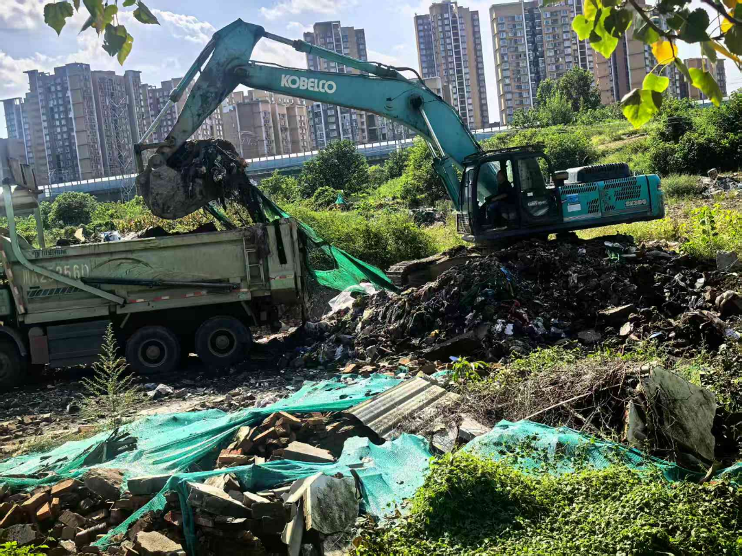 针对拆迁后遗留的砖瓦、混凝土块等建筑垃圾渣土,制定“分类整理、集中转运”的科学清运方案,明确分工、高效协同——综合执法办负责现场秩序维护与规范督导,城乡更新办统筹协调清运车辆与处置点位,来龙村负责现场引导与群众沟通。清运过程中,工作人员严格落实扬尘防控要求,对作业区域定时洒水降尘,对清运车辆实行密闭覆盖,确保“清运不扬尘、转运不遗撒”,最大限度降低对周边环境的影响。