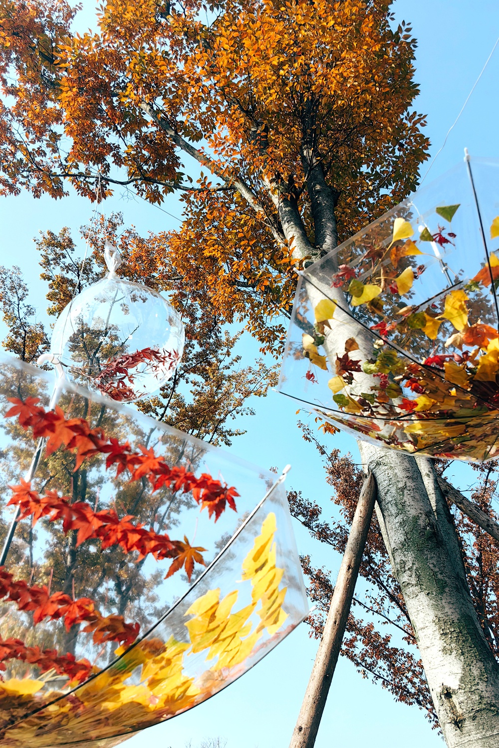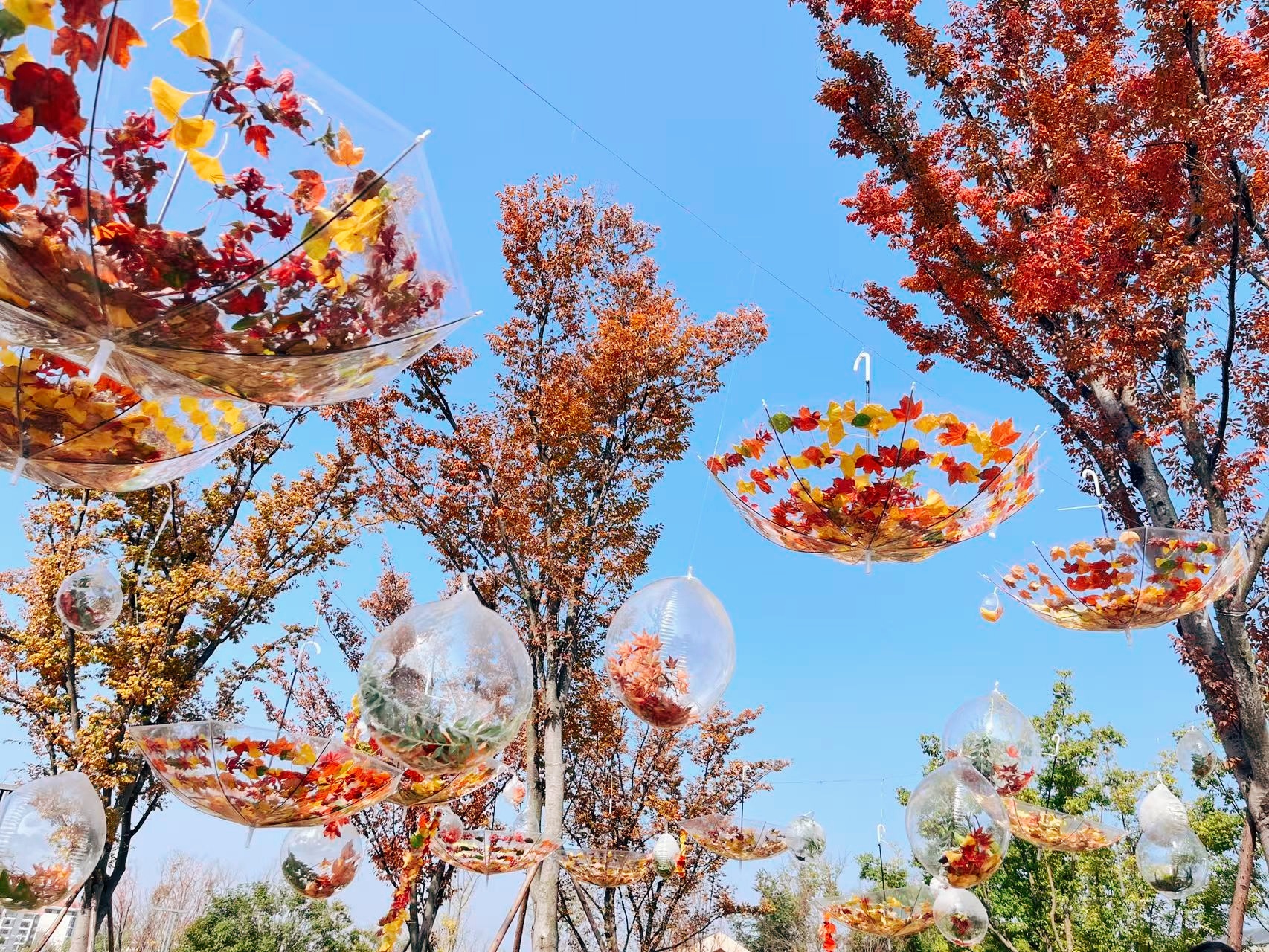 以落叶为素材,打造"秋收透明桶""落叶风铃"等互动装置,市民可亲手拾叶创作,在透明雨伞与气球构成的童话场景中重拾童趣。