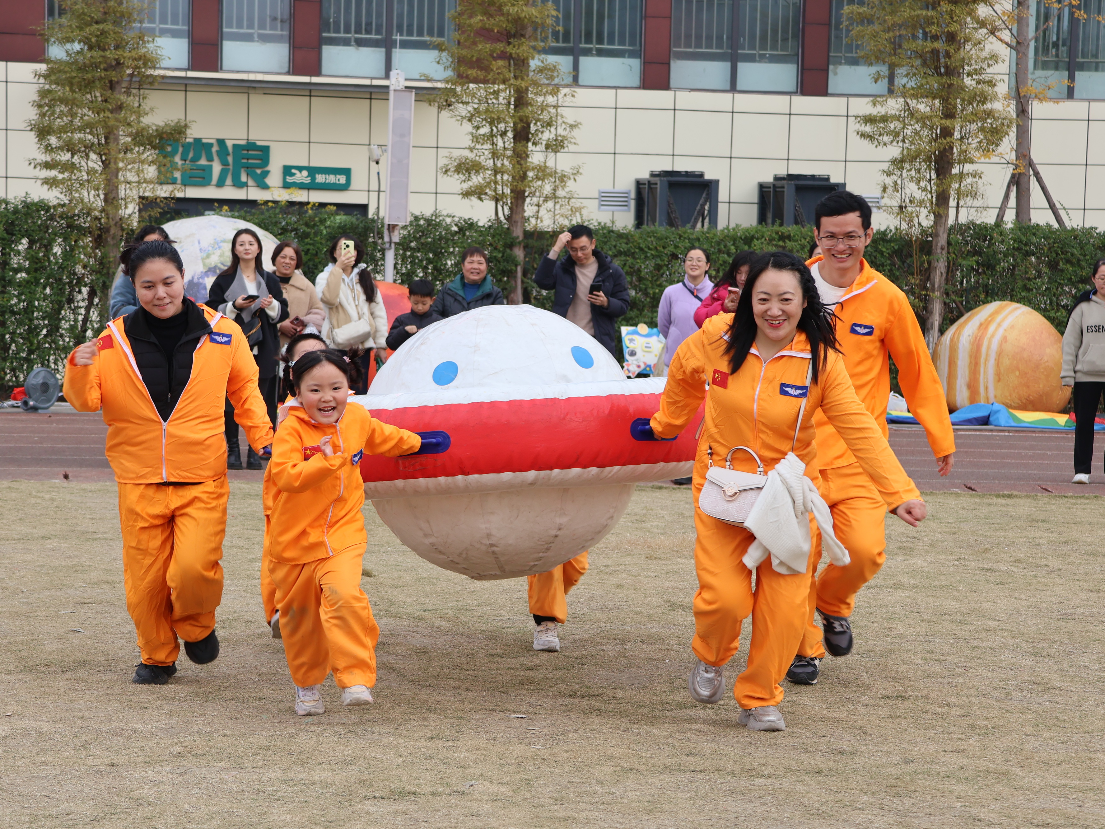 活动现场被浓郁的“星际元素”包裹,“太空飞船”“小小宇航员”“多彩星球”等布置,瞬间将场地打造成童趣满满的“星际乐园”。家长与孩子化身“星际伙伴”,携手挑战各类趣味运动项目:有的亲子组合默契配合,举着“星球飞碟”在赛道上快速穿梭;有的弯腰协作,共同将“太空飞船”平稳运送至指定区域;还有的小手牵大手,踩着“星际脚印”稳步向前。赛道上欢呼声与笑声交织,既迸发着运动的活力,也流淌着亲子间的温馨。